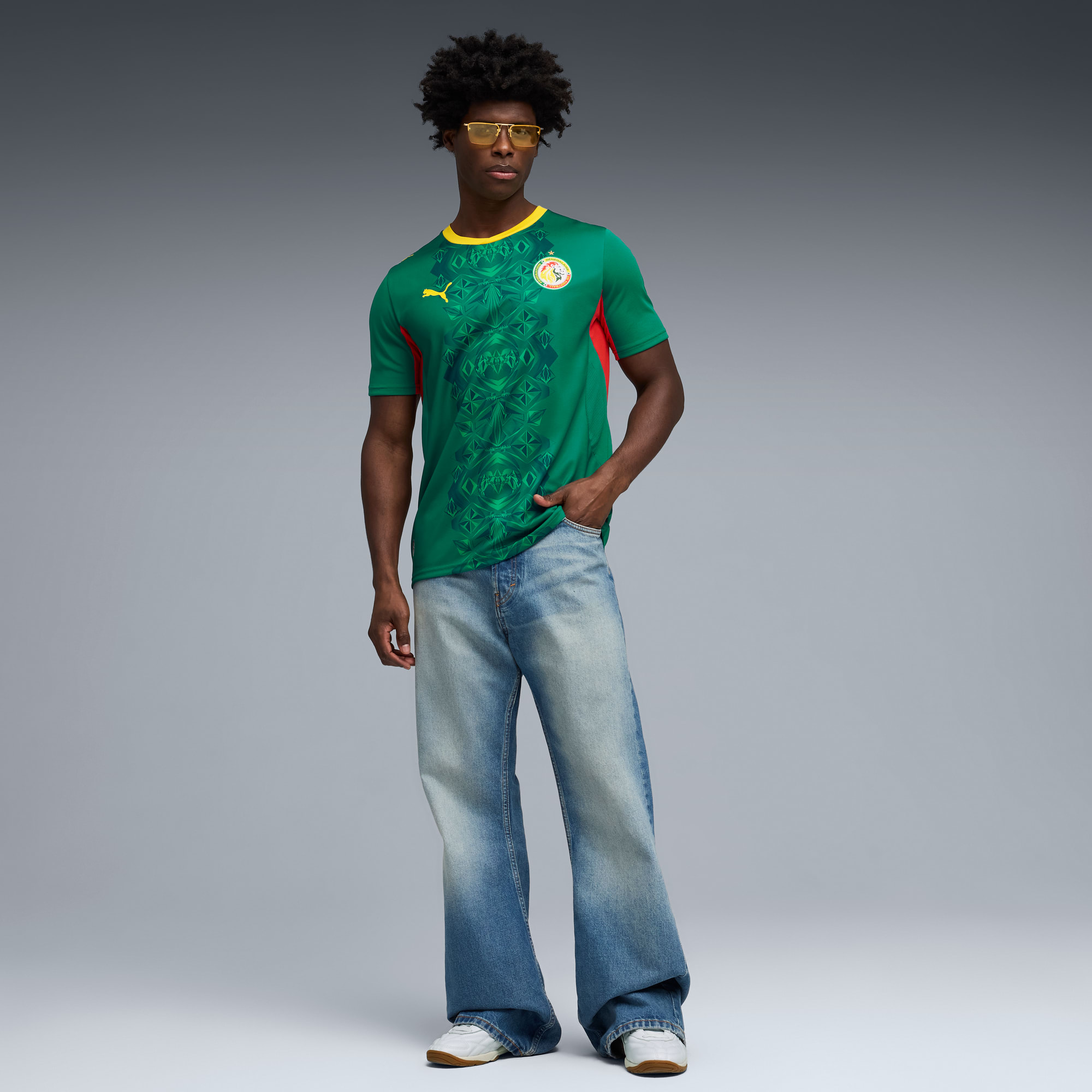 The Puma logo is applied in yellow on the right chest and shoulders, with the Senegal crest positioned on the left chest beneath a single star. A small detail is placed on the upper back below the collar, referencing the national team identity.