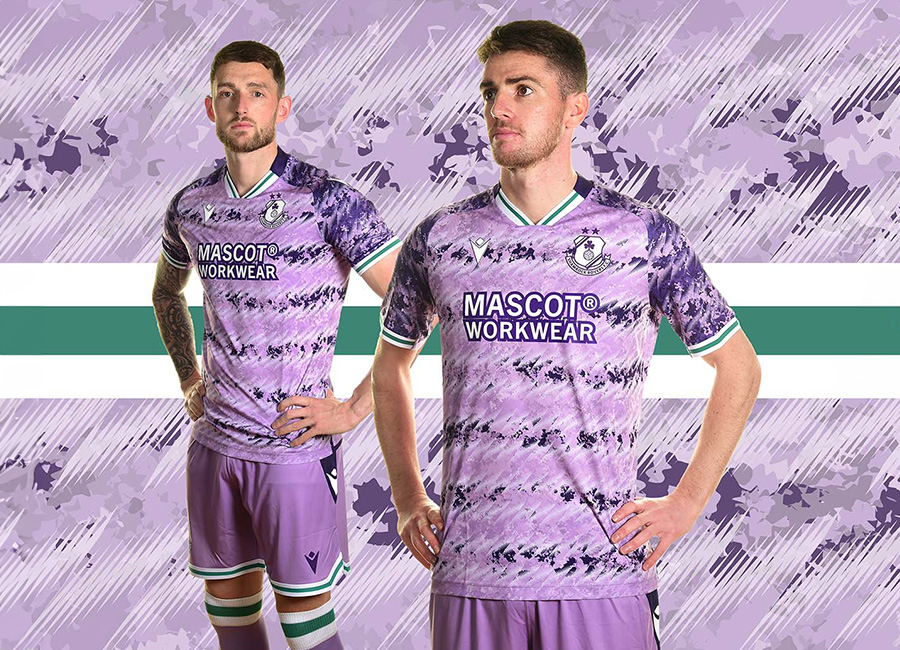 The kit is primarily lilac, with subtle sublimation graphics inspired by the club’s 1993/94 away shirt. The design features darker lilac pattern across the body and sleeves, complemented by a V-neck collar with white and green knitted inserts, which are mirrored on the sleeve edges.