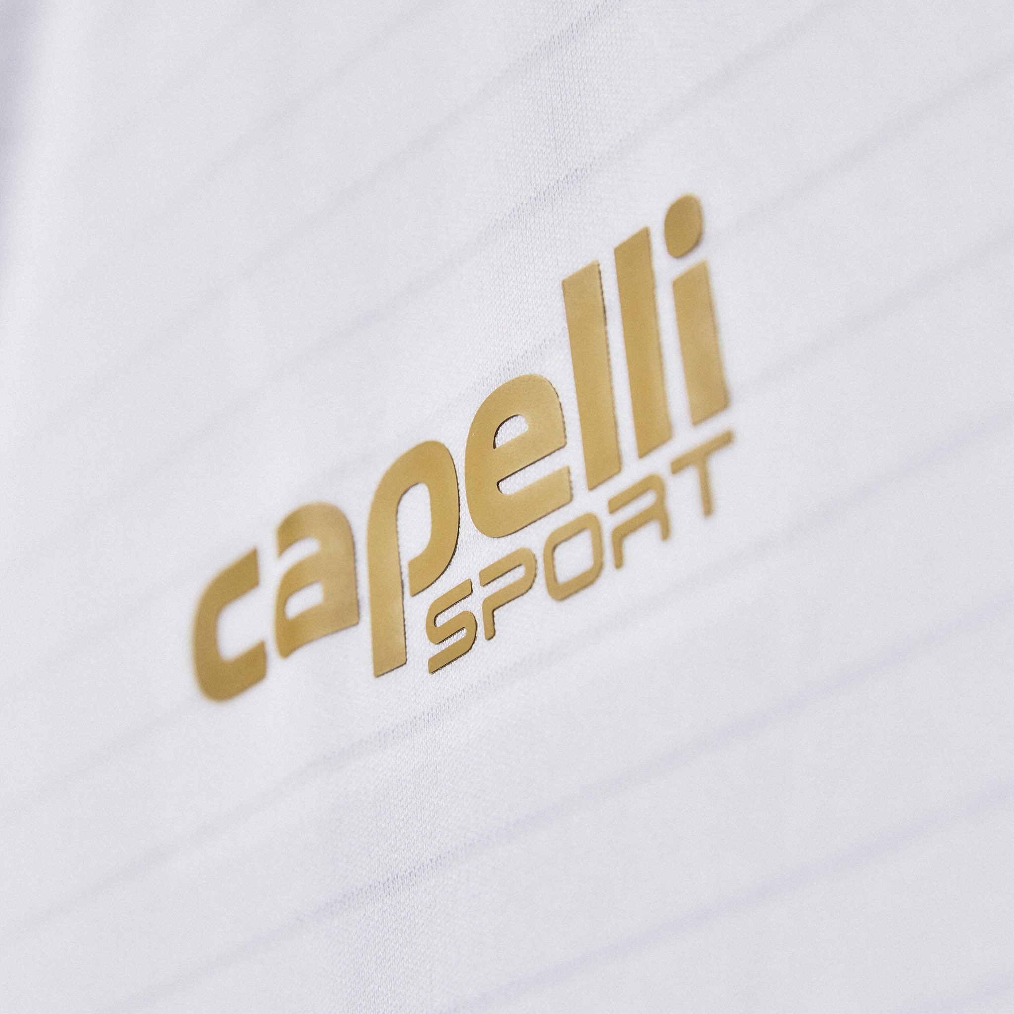 Featuring a clean white base, the shirt is highlighted by elegant gold accents, including the club crest, sponsor logo, and Capelli branding. Fine horizontal pinstripes add subtle texture, with a golden trim on the collar and sleeves.