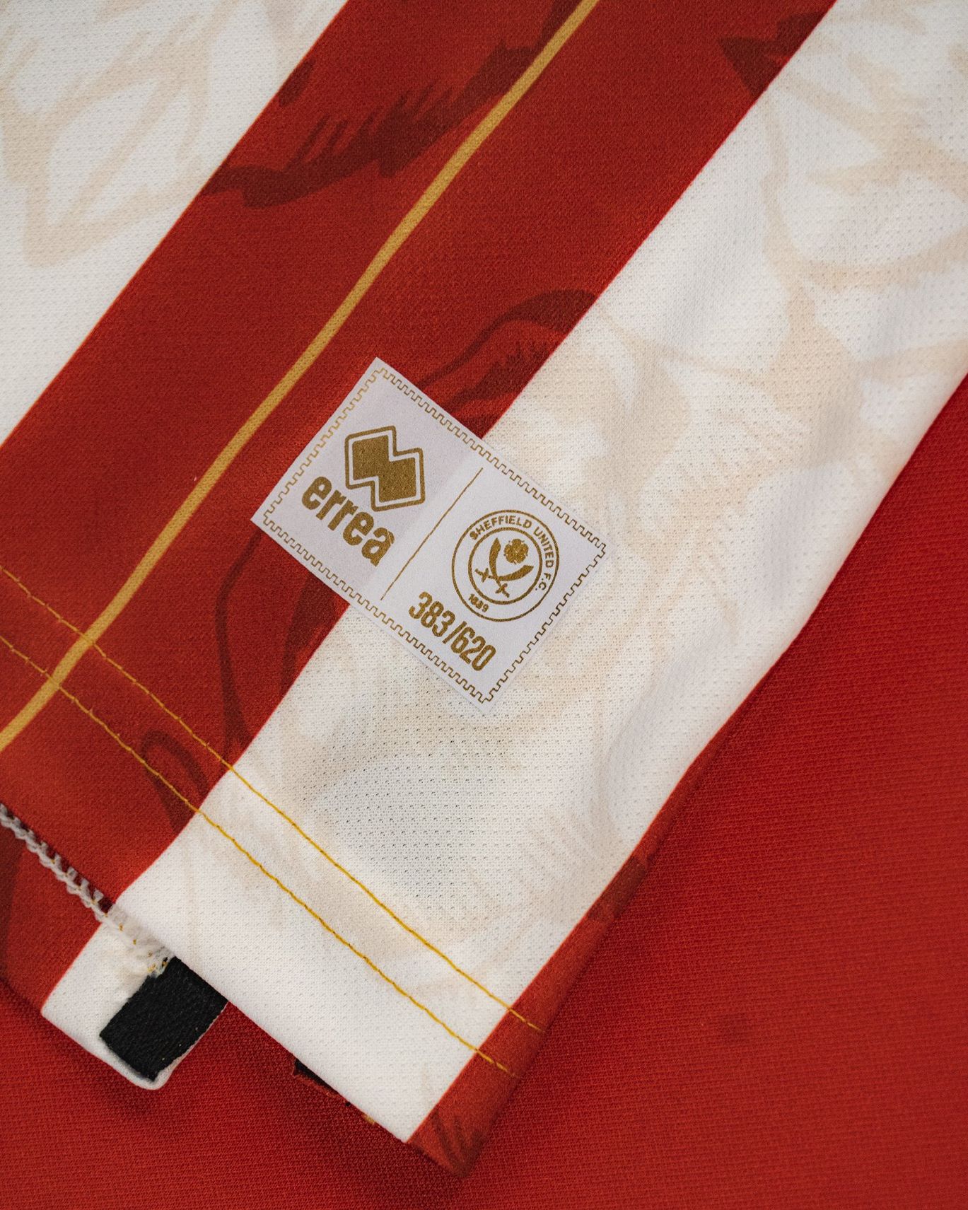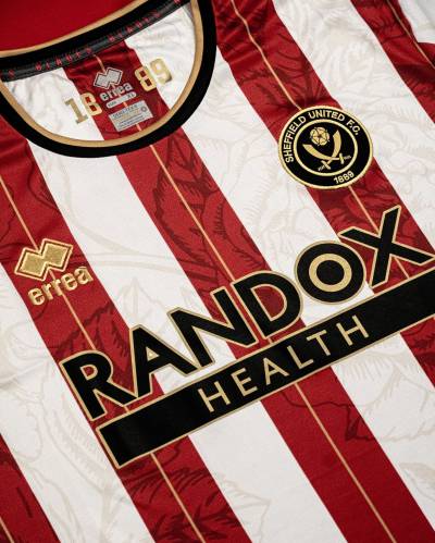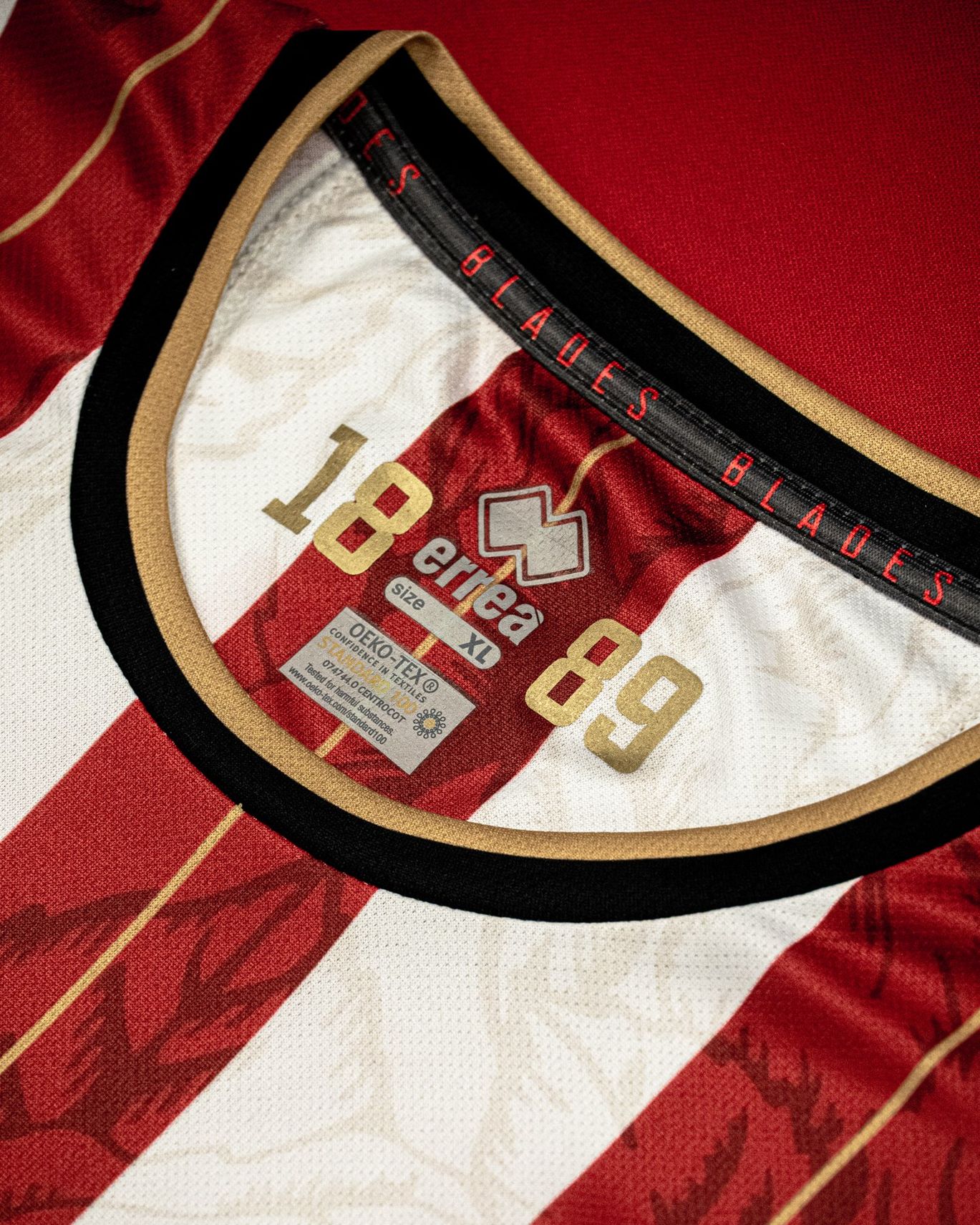 The right breast of the shirt proudly displays the golden Erreà logo. A symbolic embroidery of Sheffield United's historic crest is positioned over the heart, encapsulating the team's unity and unwavering passion. Adding a touch of elegance to the overall design, the crew neck and sleeves are adorned with stylish black and gold trimmings.