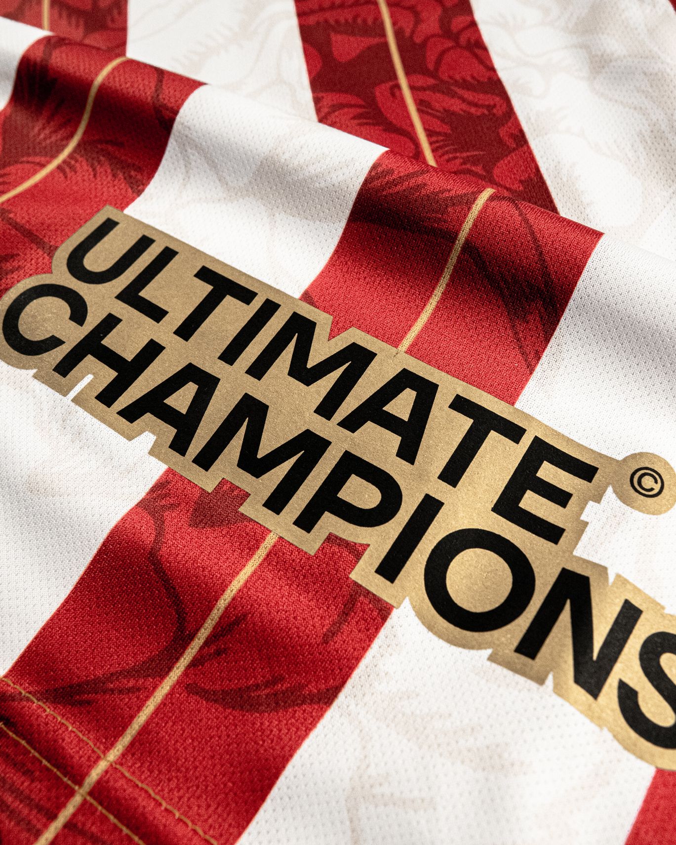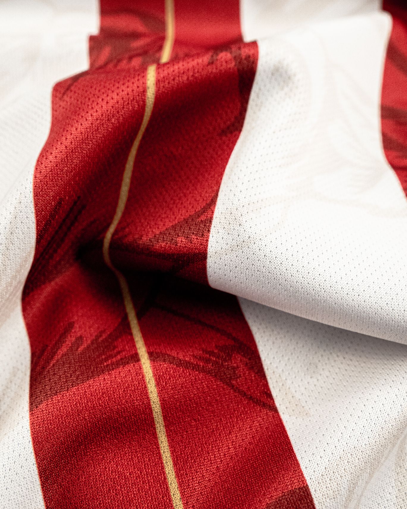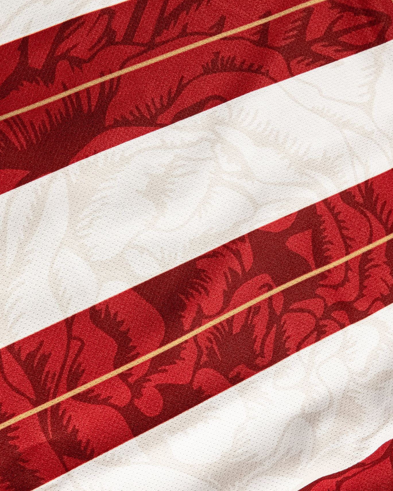 Created in collaboration with official partner Erreà, this shirt showcases the club's renowned striped home design, adorned with five striking royal red stripes and a prominent gold line running through the centre, symbolising their ascent to the pinnacle of English football. Adding to its intricate details, the shirt also features four elegant white stripes that subtly unveil a delicate rose pattern, serving as a tribute to the emblematic rose of Yorkshire proudly displayed on the team's crest.