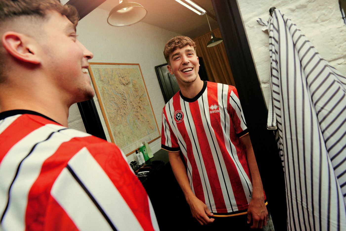 The kit also includes a personalised sweatband with '1889 SUFC' and the inner collar displays the club and academy motto, ‘Out Run. Out Fight. Out Play’. The kit is completed with black shorts and black or red socks.