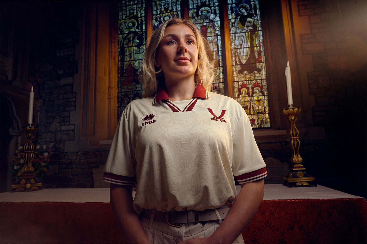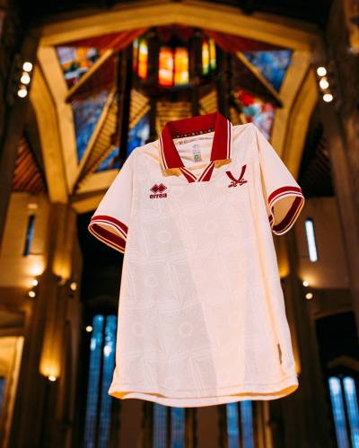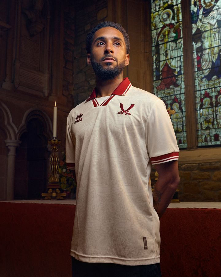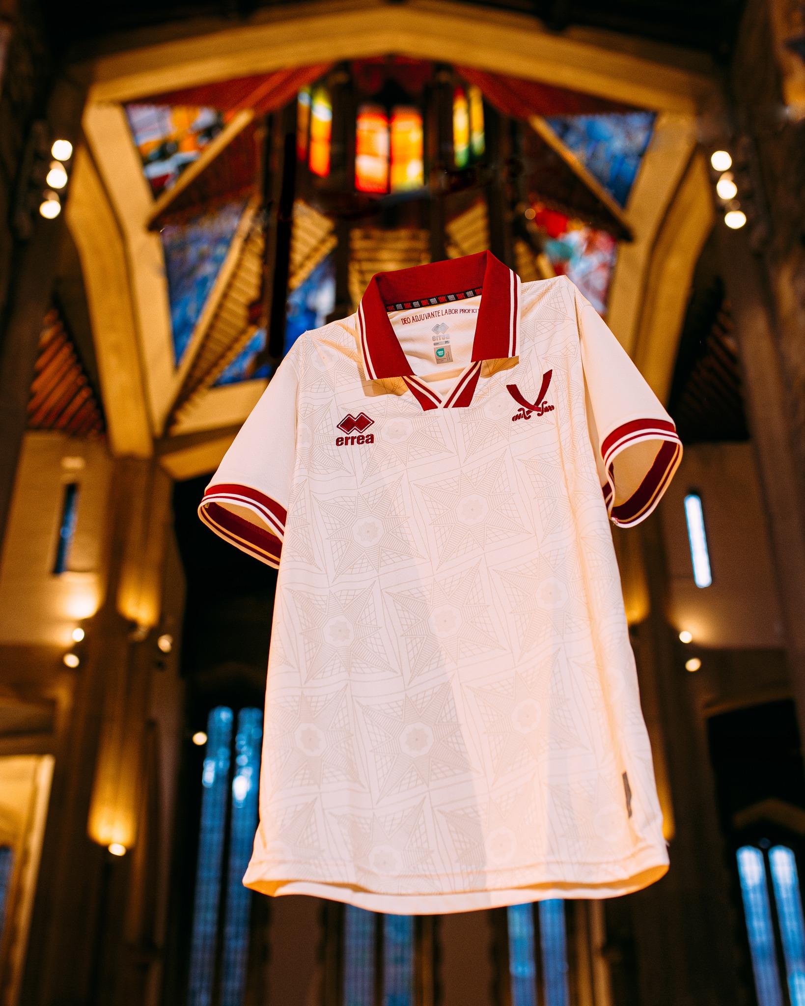 The latest secondary-change release from Erreà is in “ivory cream” with maroon and boasts a base pattern representing the Lantern Tower ceiling within Sheffield Cathedral.