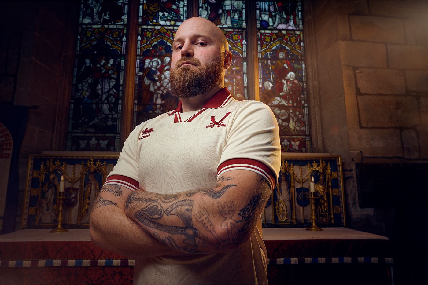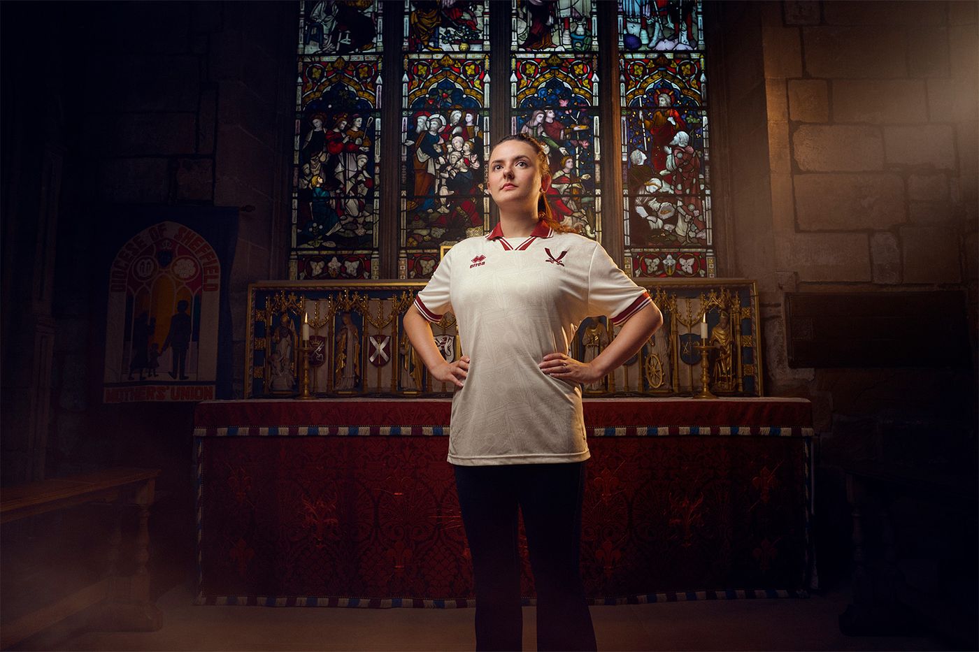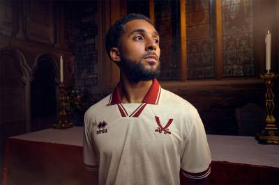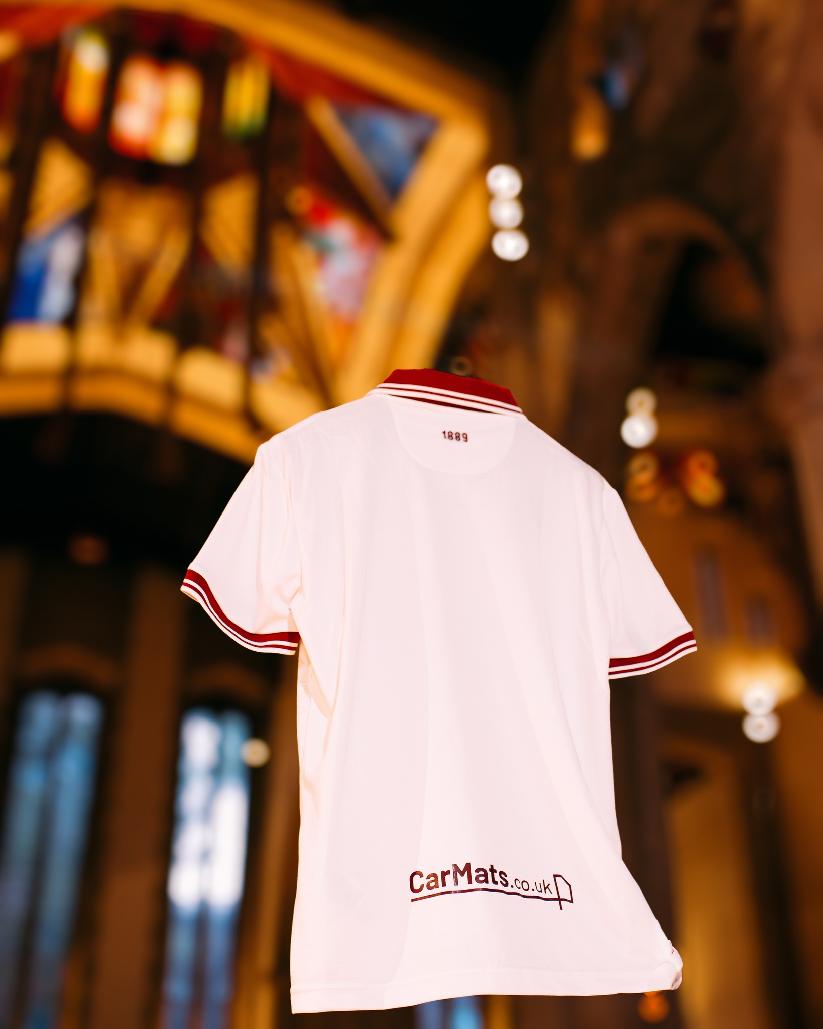 The latest secondary-change release from Erreà is in “ivory cream” with maroon and boasts a base pattern representing the Lantern Tower ceiling within Sheffield Cathedral.