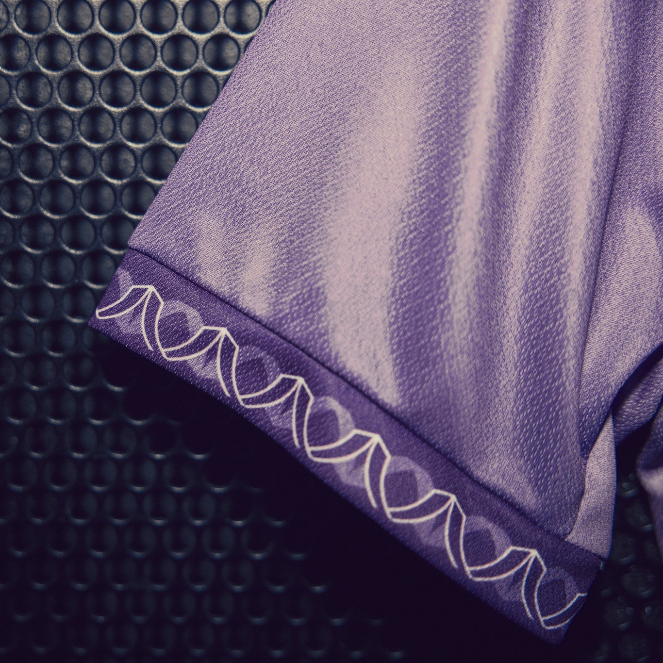 The Erreà shirt features a lilac base with tonal purple accents, with dynamic fine-lined graphics sweeping across the front and circular patterns on the sleeve cuffs.