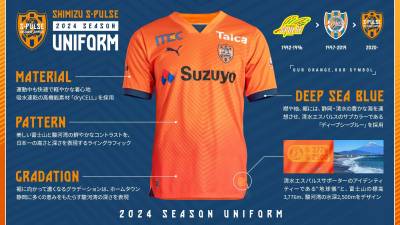 The Japanese J2 League side’s 2024 primary release is in shades of orange with a chevron gradient effect that celebrates the local juxtaposition of Japan’s highest point - Mount Fuji - with the country’s deepest bay (also nodded to in the “sea blue” trim), with the change following the same design but in white and grey with navy (“deep sea”) blue.