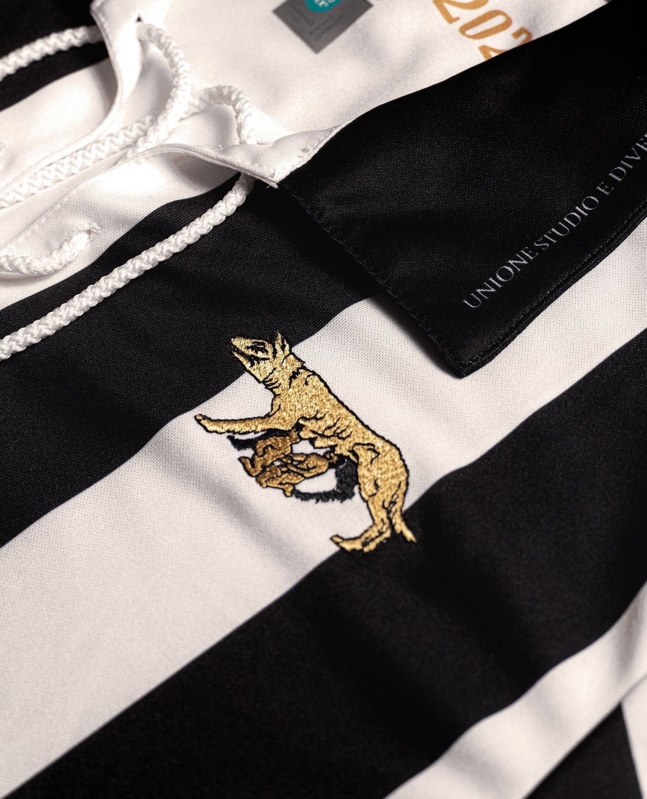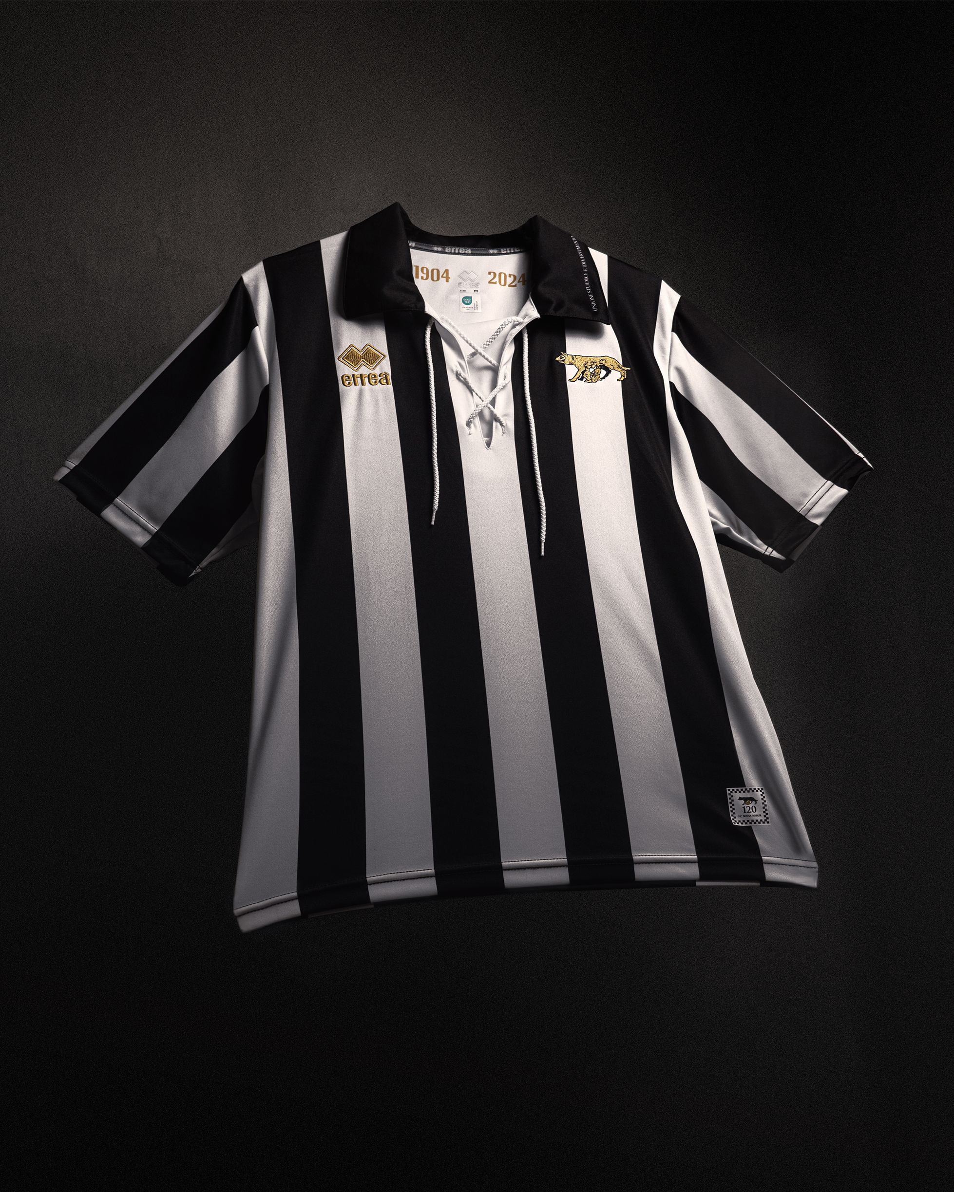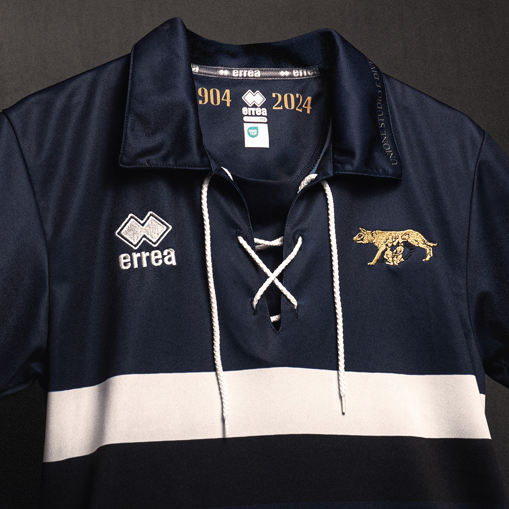 The Erreà home shirt features classic black and white vertical stripes, an inside detail with "1904-2024," and a lace-up neckline that recalls the club’s origins. Gold accents, including the embroidered Erreà logo and the Senese Wolf, a symbol of Siena’s mythological roots, are embroidered on the chest. The number "120" is displayed on the back of the neck, and a label with the Wolf enclosed in a black-and-white checkerboard design reinforces the club’s identity.