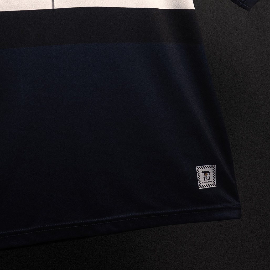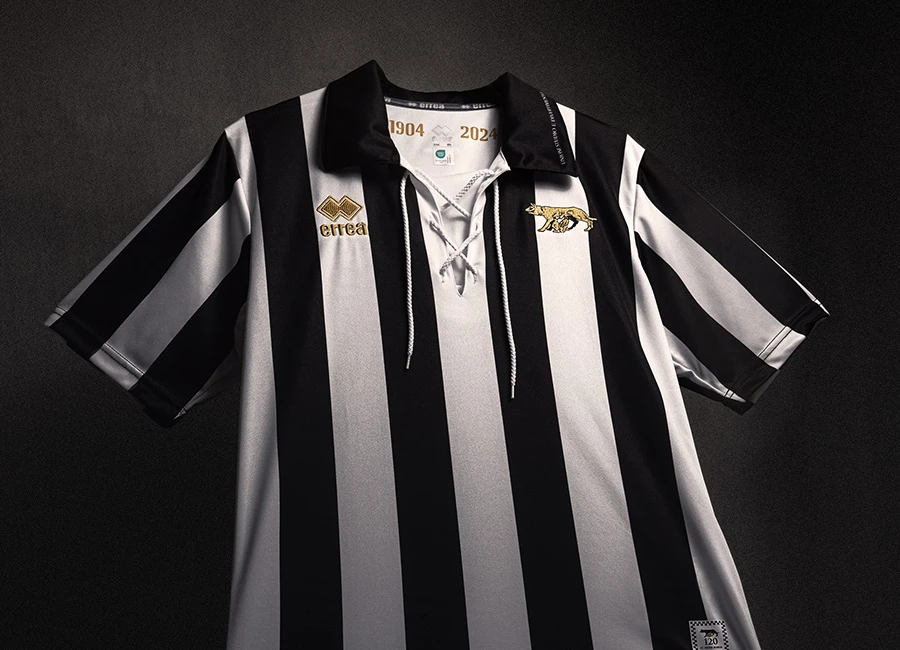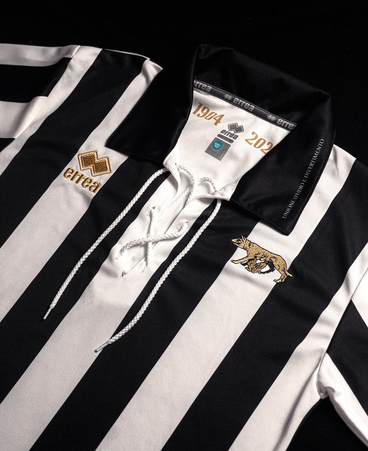 The Erreà home shirt features classic black and white vertical stripes, an inside detail with "1904-2024," and a lace-up neckline that recalls the club’s origins. Gold accents, including the embroidered Erreà logo and the Senese Wolf, a symbol of Siena’s mythological roots, are embroidered on the chest. The number "120" is displayed on the back of the neck, and a label with the Wolf enclosed in a black-and-white checkerboard design reinforces the club’s identity.
