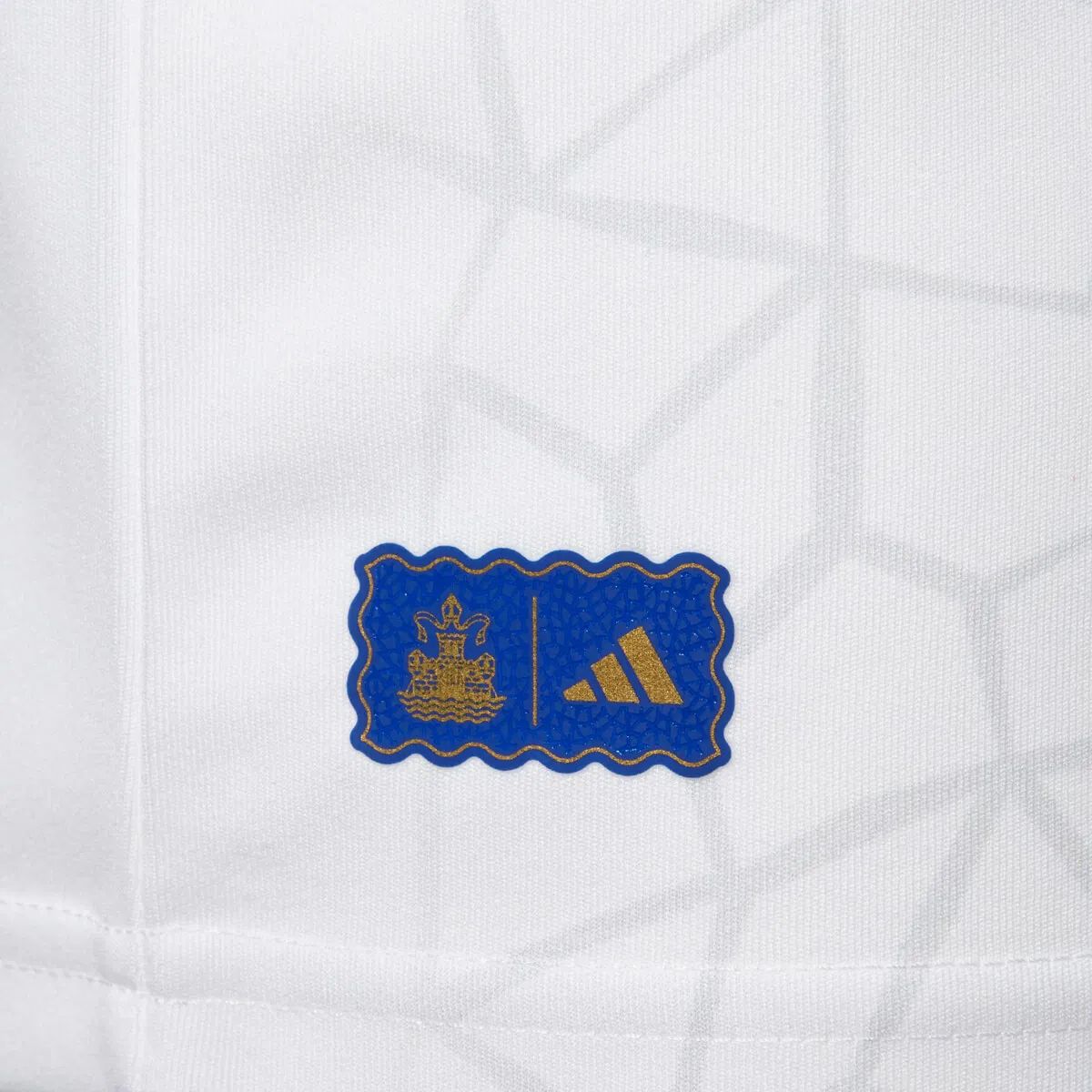This is in full colour, the German supplier’s logos are in blue and their shoulder stripes in red, other sponsor branding largely keeps to the simple palette - as does trim - and the kit is completed with matching white shorts and socks for a nominally single-coloured overall look.