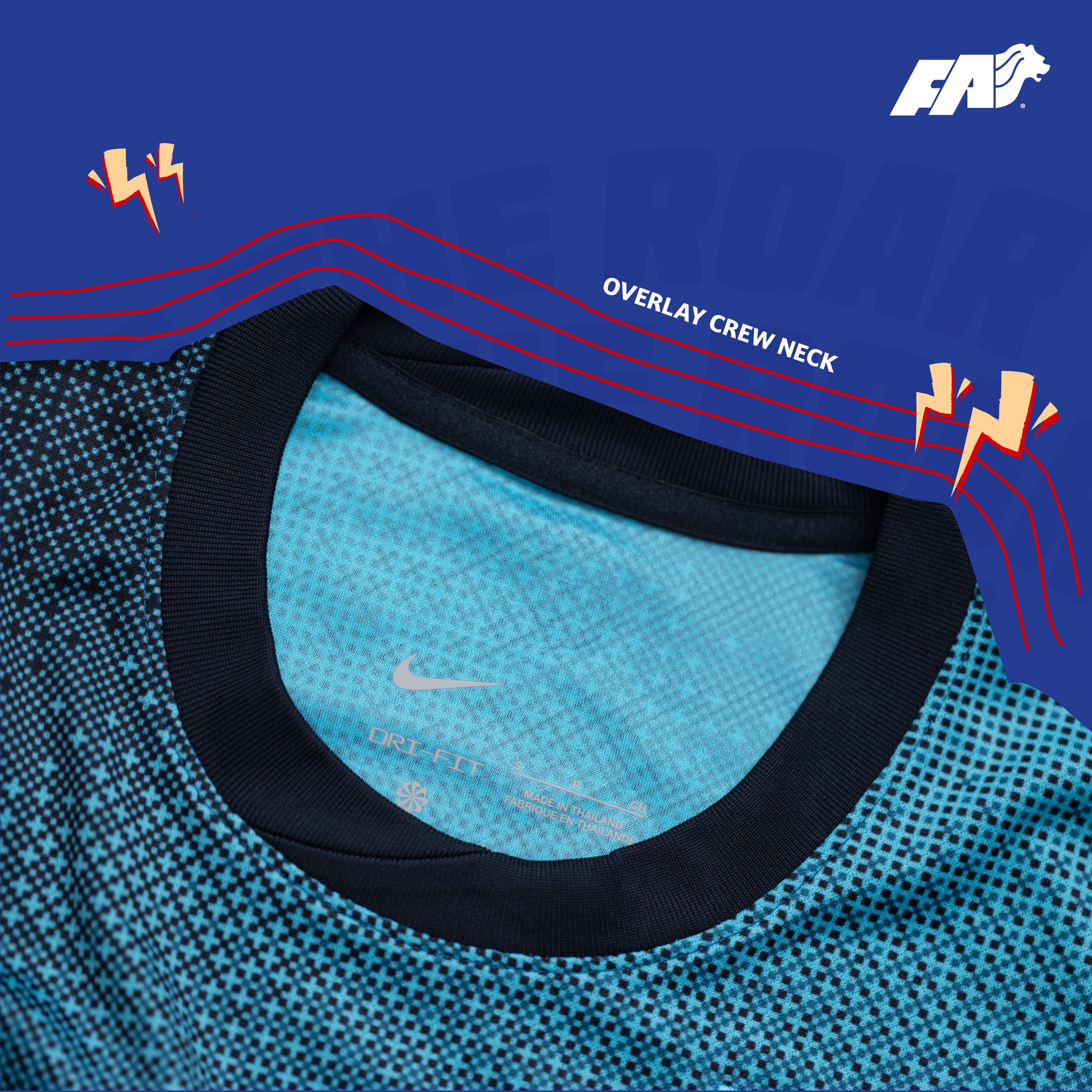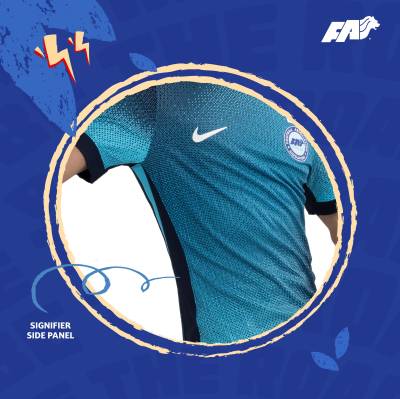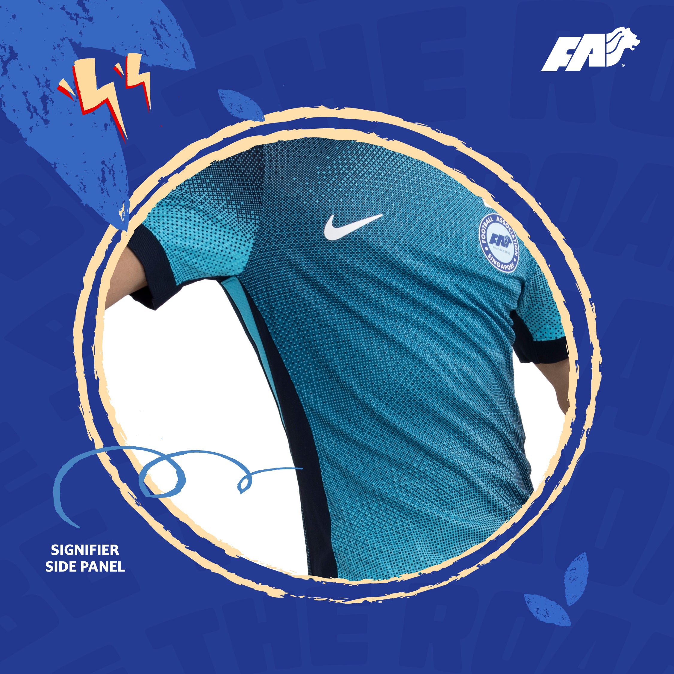 The 2024 Nike away kit features a modern graphic pattern that symbolises Singapore’s ever-changing architectural landscape, using Chlorine Blue and Marina tones to evoke the surrounding waters. The shirt’s design includes a pixelated gradient pattern across the front, which transitions from darker to lighter shades, creating a textured effect that reflects the interplay of light and water.