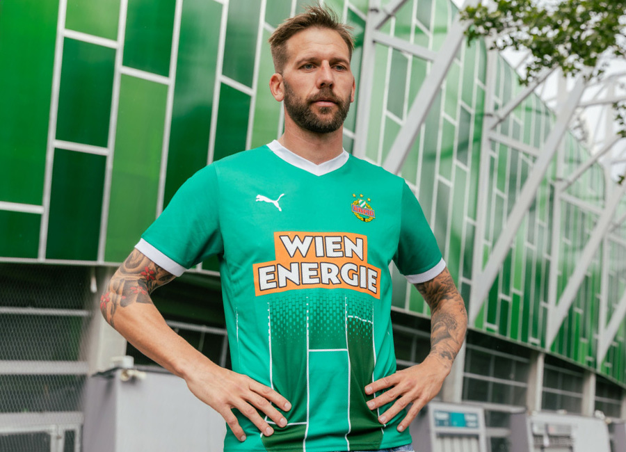 The new primary release from Puma, via 11teamsports, is in green with white and boasts an echoing of the iconic tile pattern on Rapid’s Allianz Stadion (Weststadion) home ground.