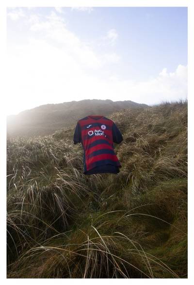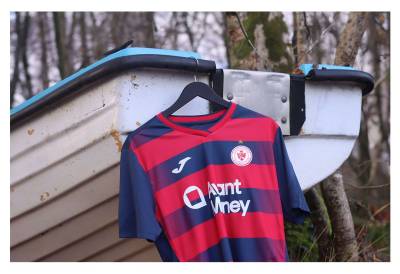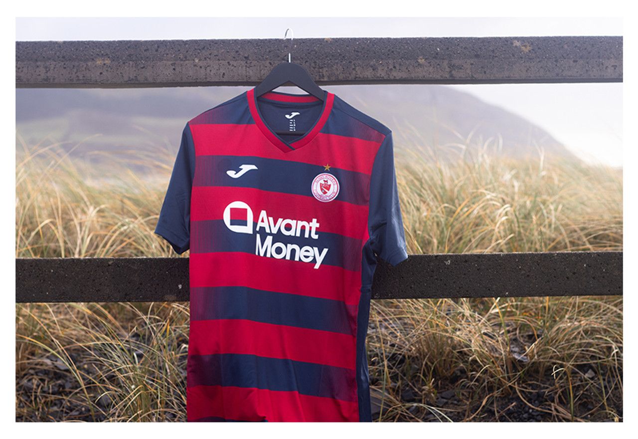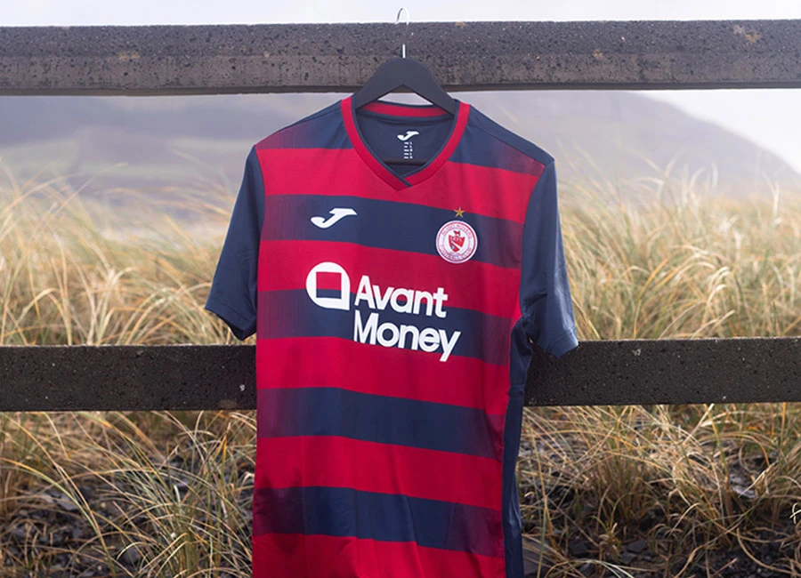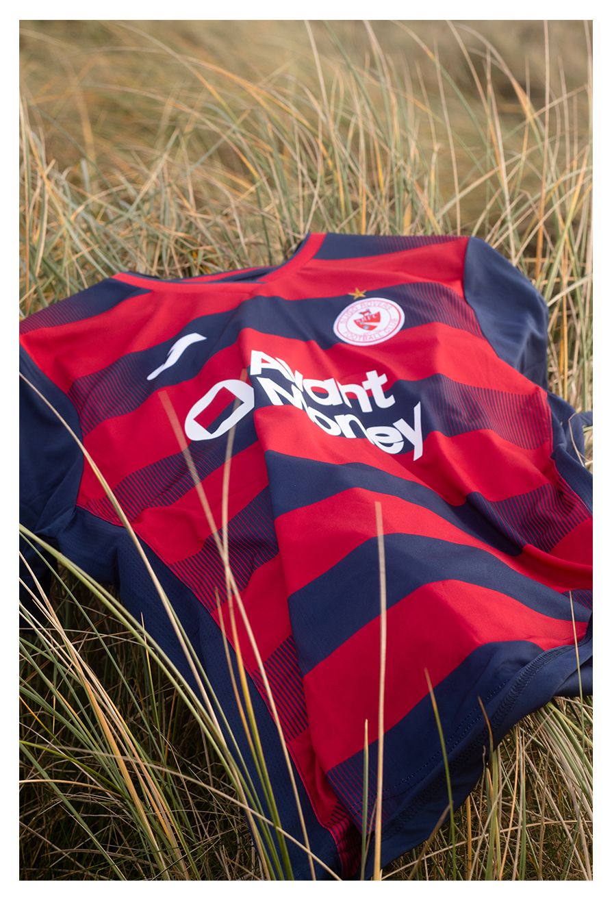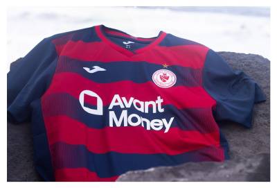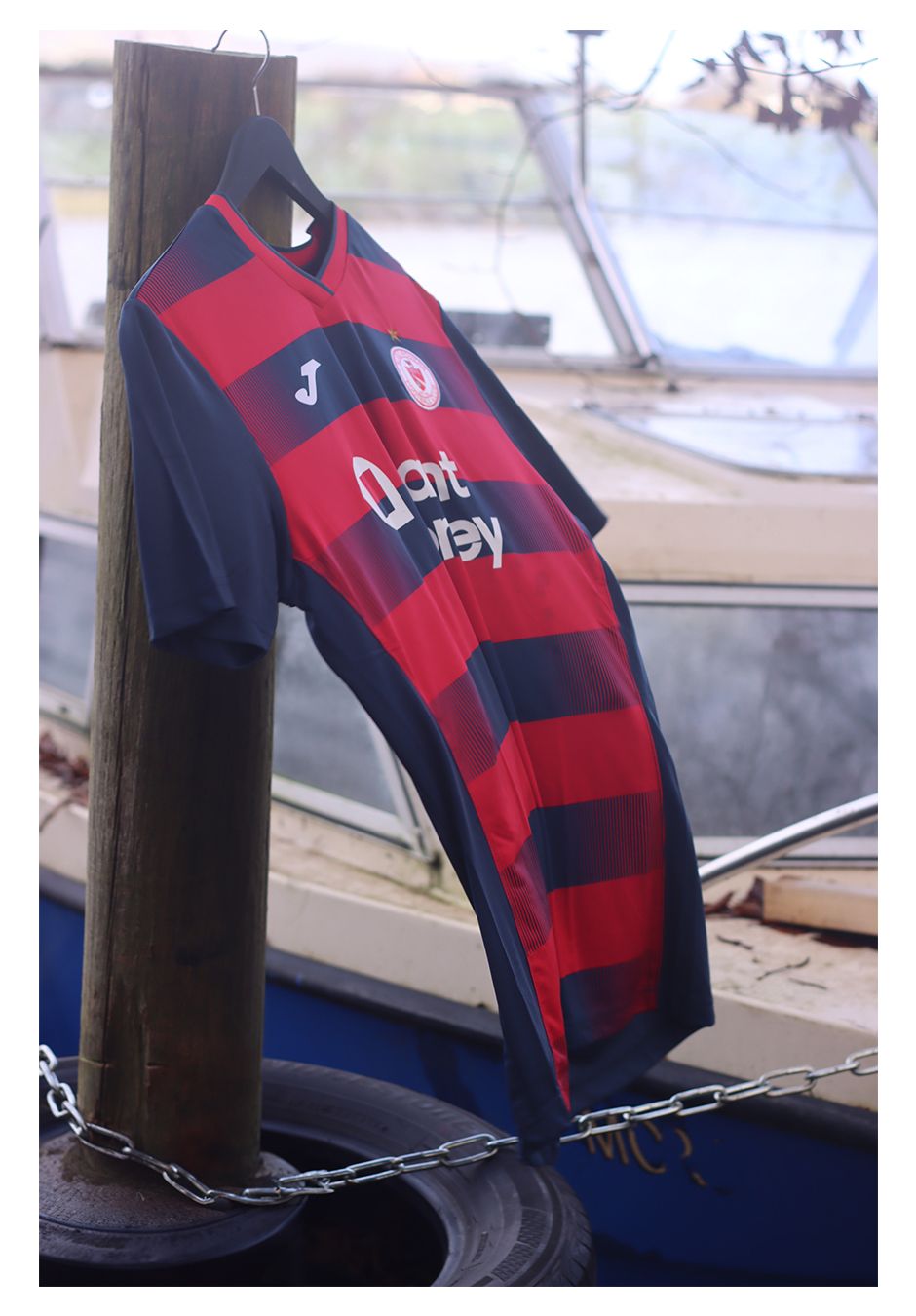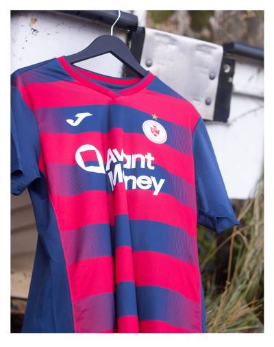 The new Joma release is in navy and red with a stylised horizontal stripes effect and a “reverse” overlapping-V neck.