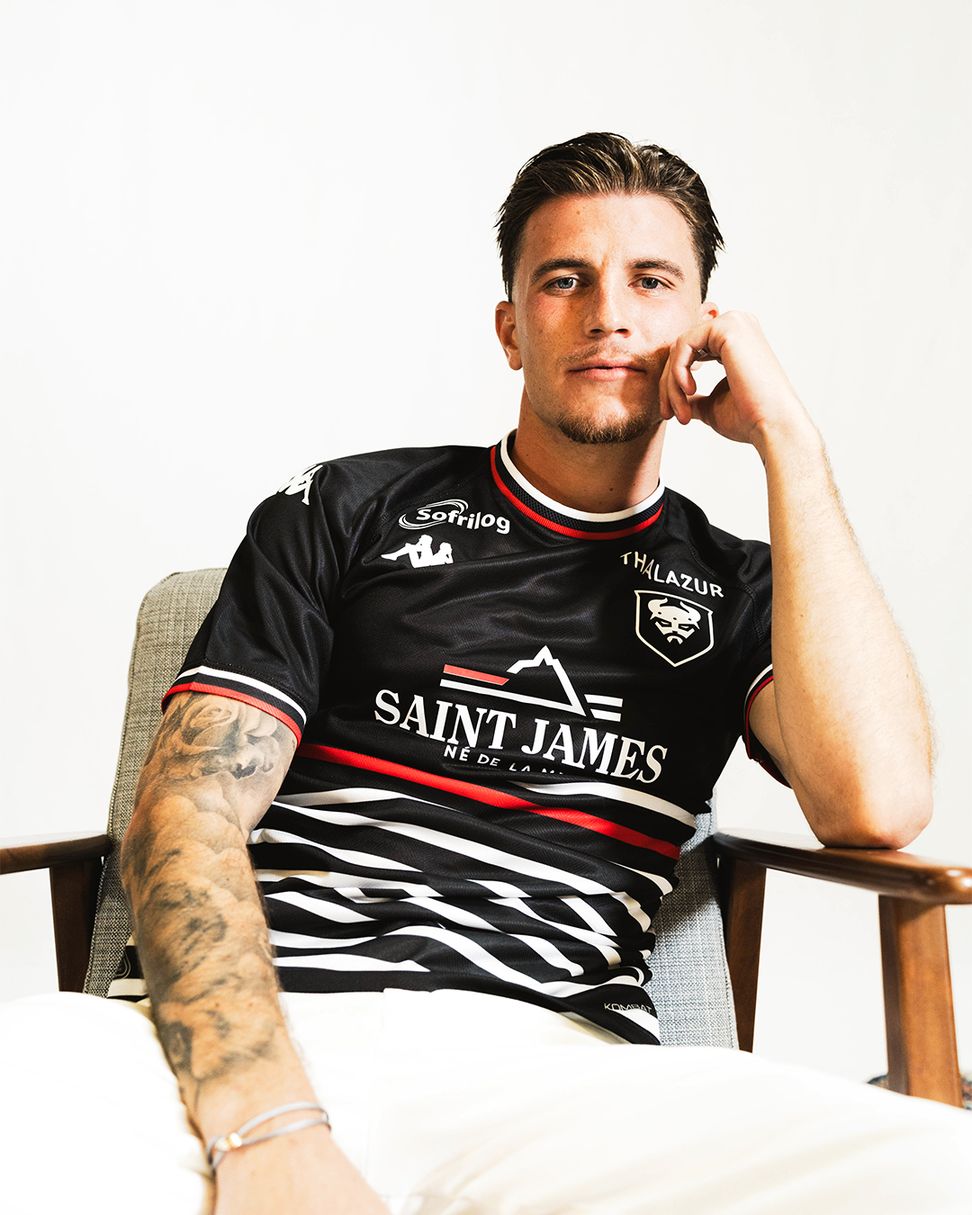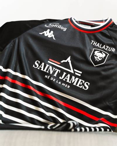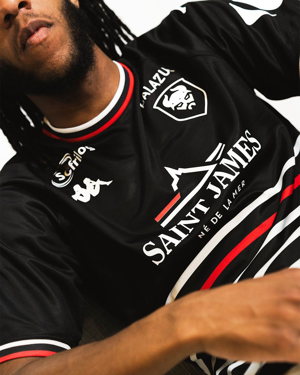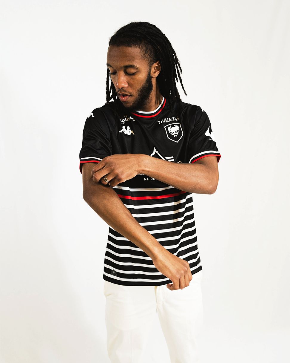 Again the fruits of a collaboration with fashion brand Saint James - also marked by the branding in the central sponsor position - the new secondary release is in black with white (mainly) and red striping in a modern take on the “marinière” look.