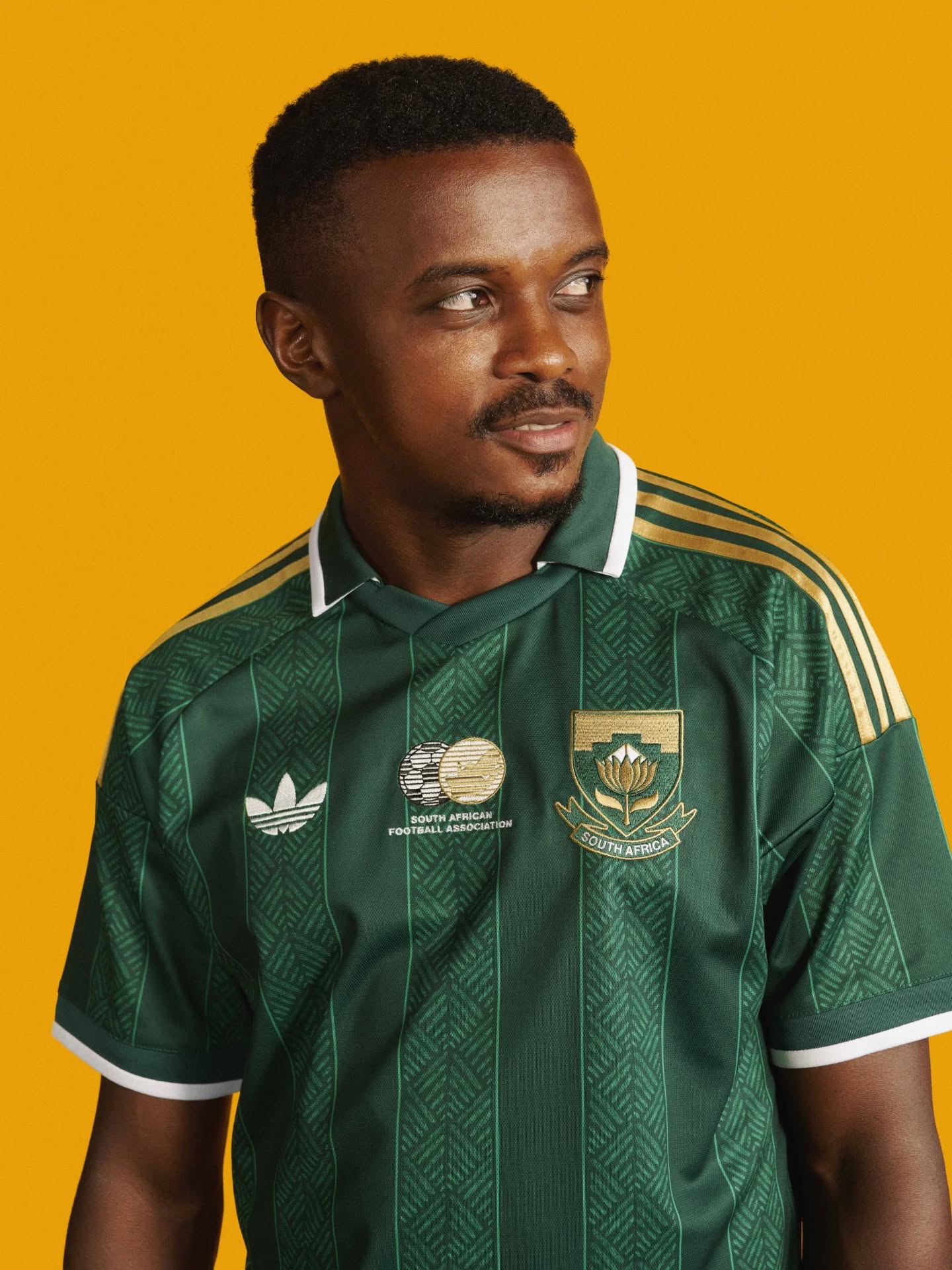 On the chest, the adidas Trefoil logo is positioned opposite the South African Football Association crest, which appears in a gold-accented execution, while a central federation logo sits between the two.