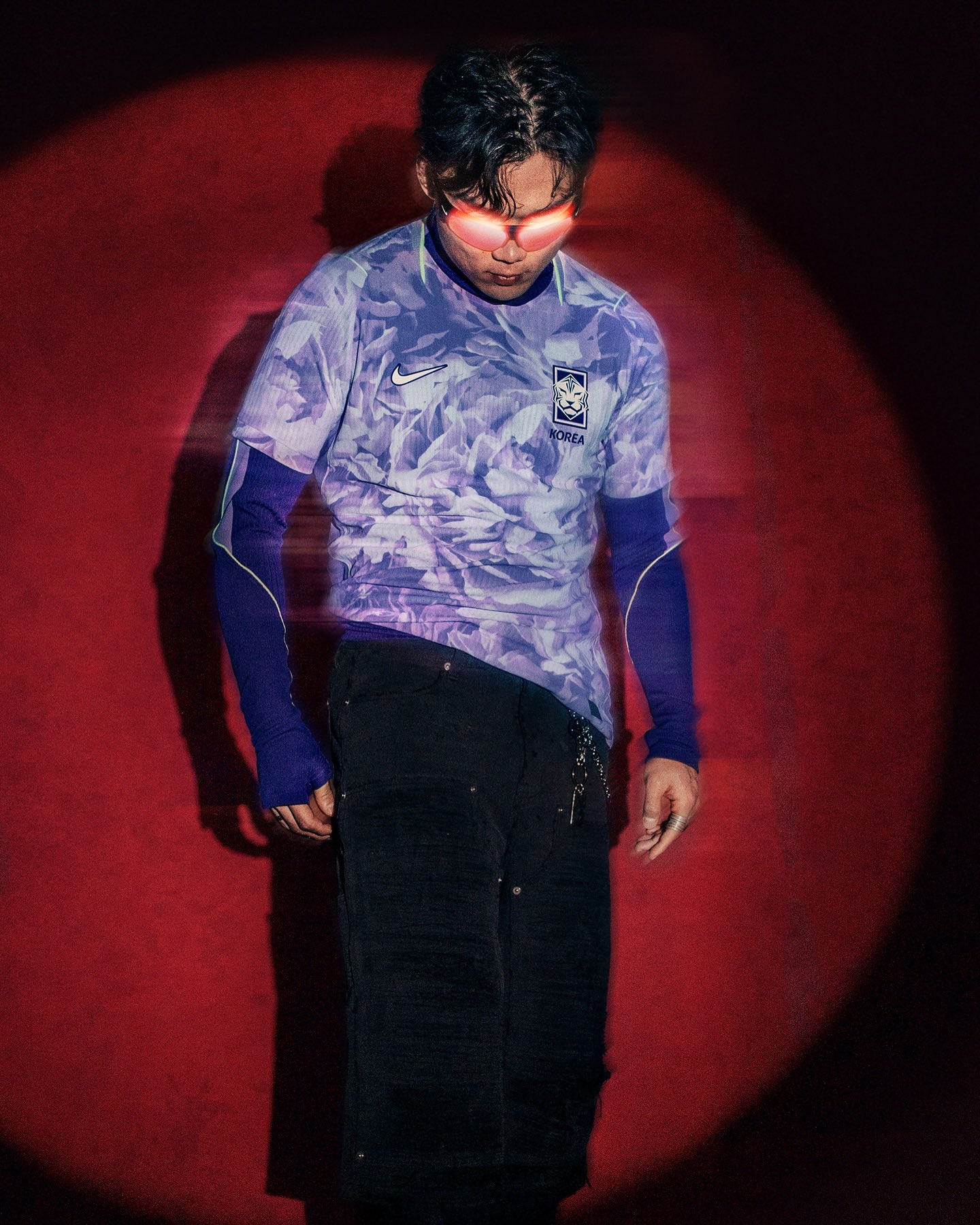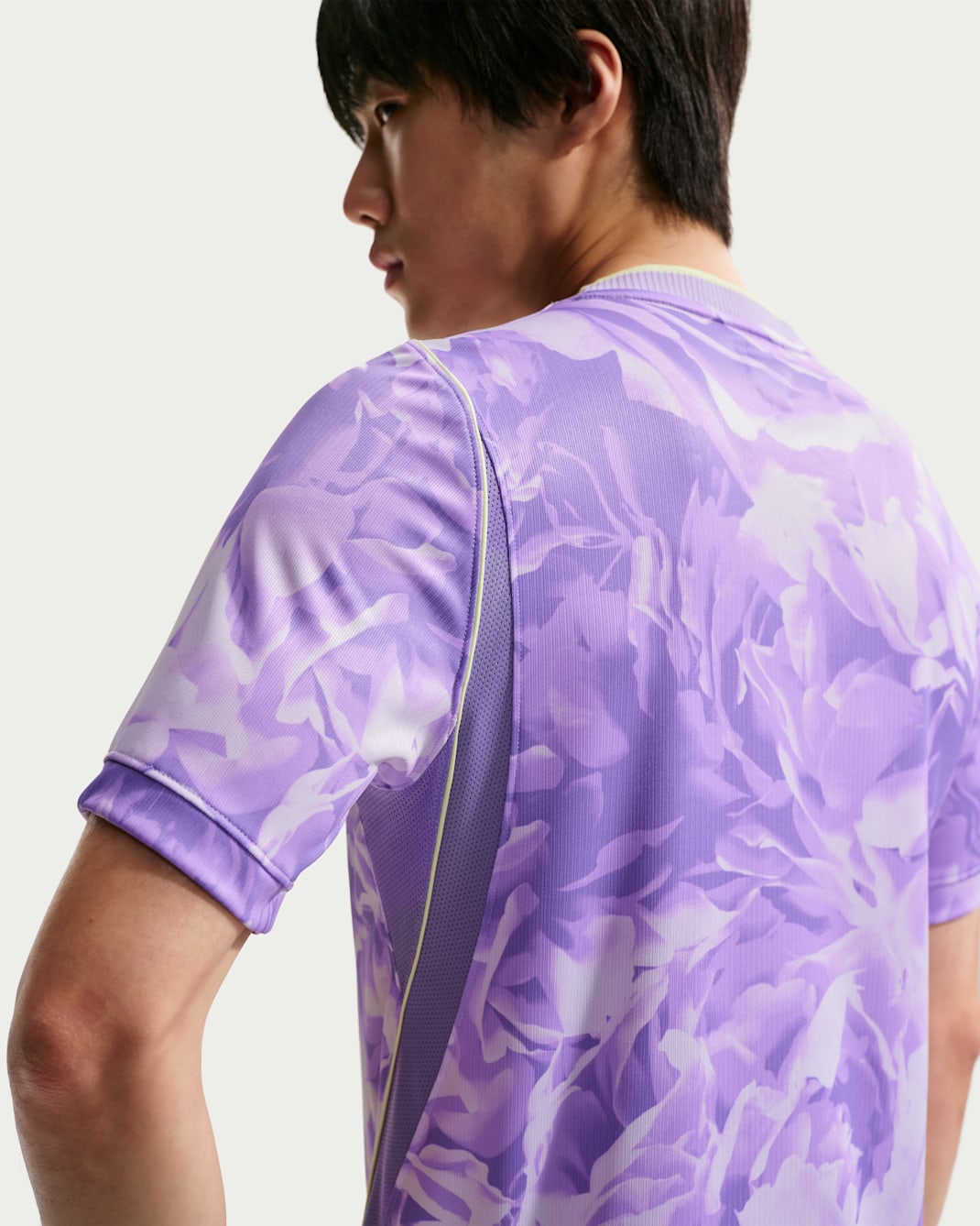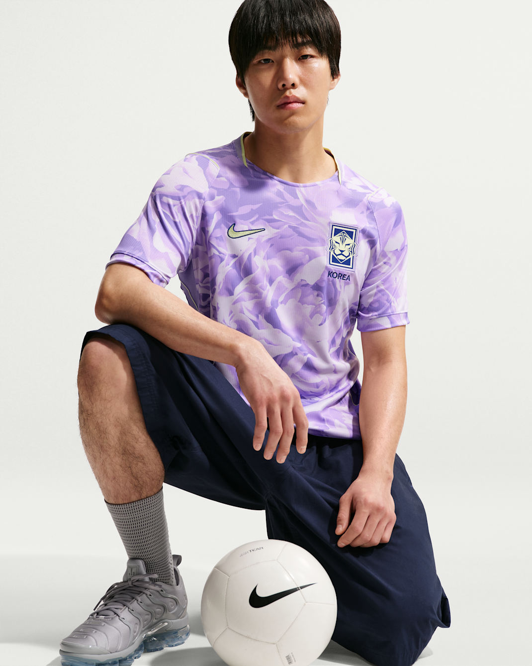 The new Korea jersey features a Space Purple base with an all over tonal graphic inspired by the condensed energy and explosive momentum of a blooming flower, visually expressing Korea's unique dynamic energy. The layered pattern features soft transitions between Amethyst Tint and lighter shades, creating depth across the front and back panels.