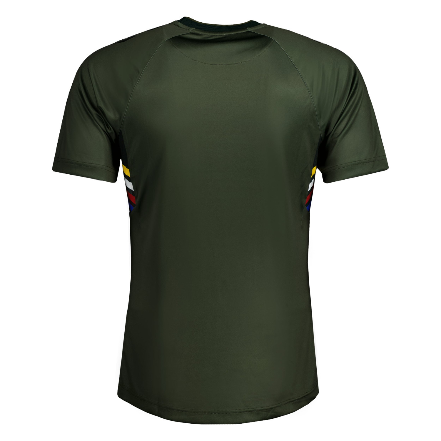 The kit is matched with dark green shorts and green and black socks. The socks also feature the four stripes inspired by the RAF Roundel.