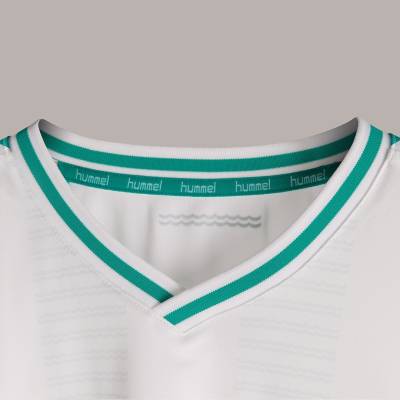 Inspired by the close proximity to the River Itchen, the city's maritime history, and the Southampton Docks, the white away shirt features a subtle striped ocean teal wave design. It is accompanied by hummel's iconic chevrons in ocean teal. At the back of the shirt, near the nape of the neck, the waves that symbolise the city can be found.