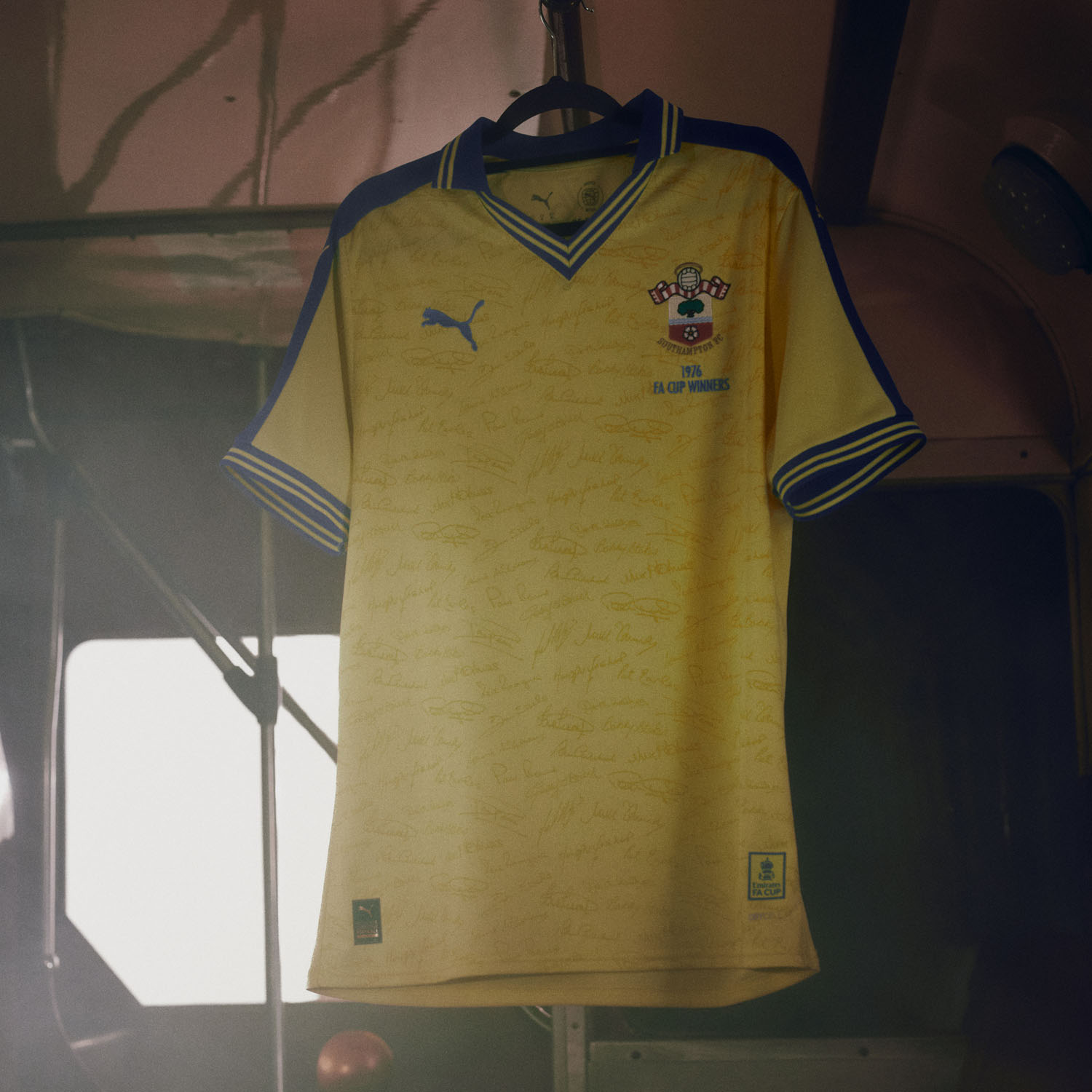 Produced by Puma, the limited edition Southampton football shirt revisits the yellow and blue colourway worn during the 1976 FA Cup Final, with modern performance construction applied for contemporary match use. The Southampton jersey features a V-neck collar with blue trim, matching sleeve cuffs, and contrasting shoulder panels that reflect the layout seen in the original cup-winning design.