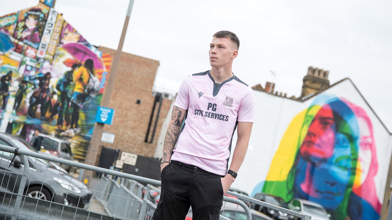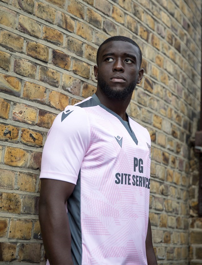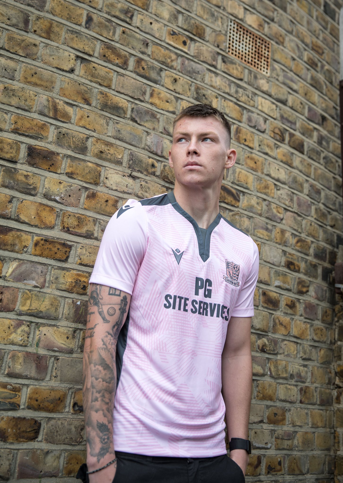 The grey trim also runs down the sides of the shirt, while the shorts are grey with a pink Southend badge. The full kit is complete with grey socks.