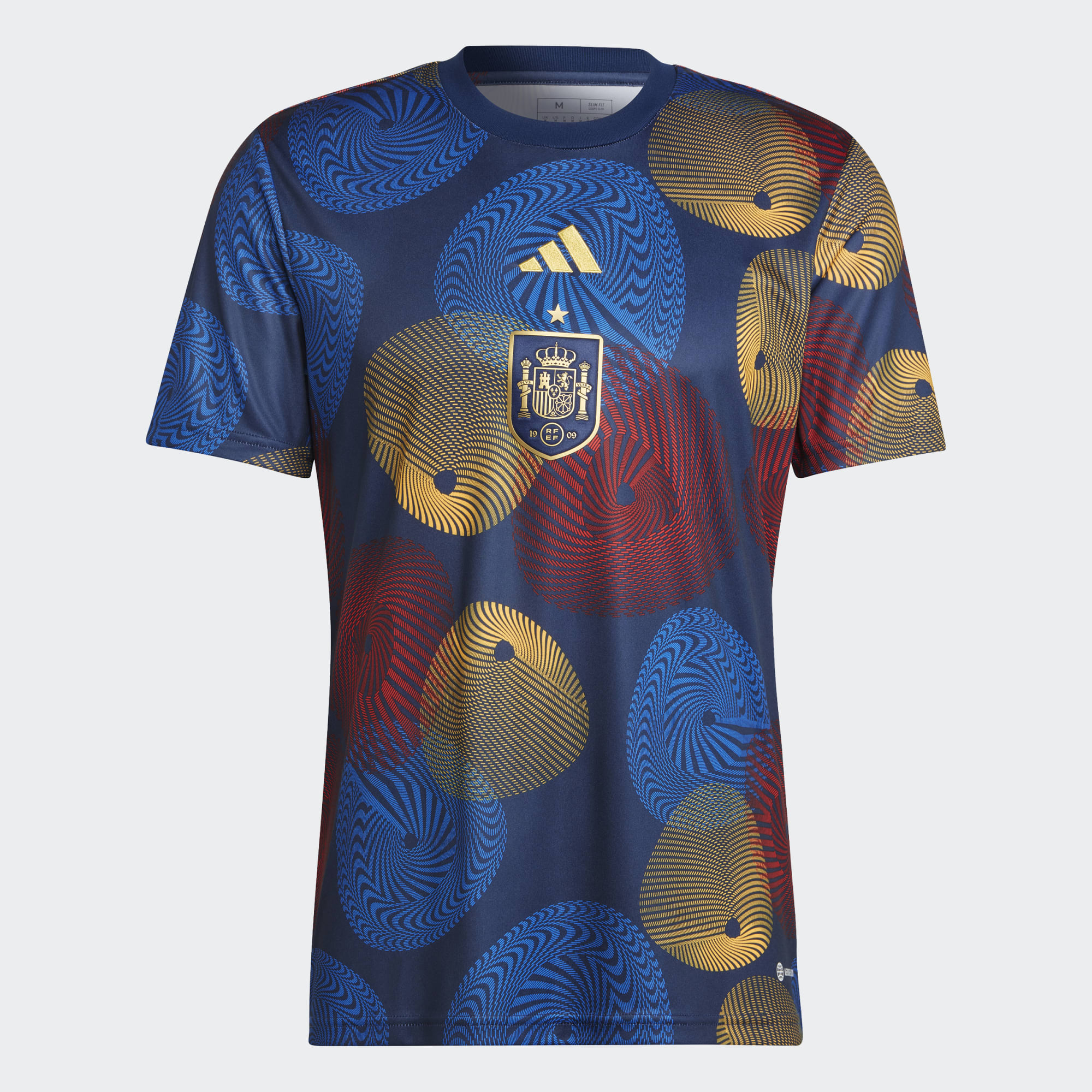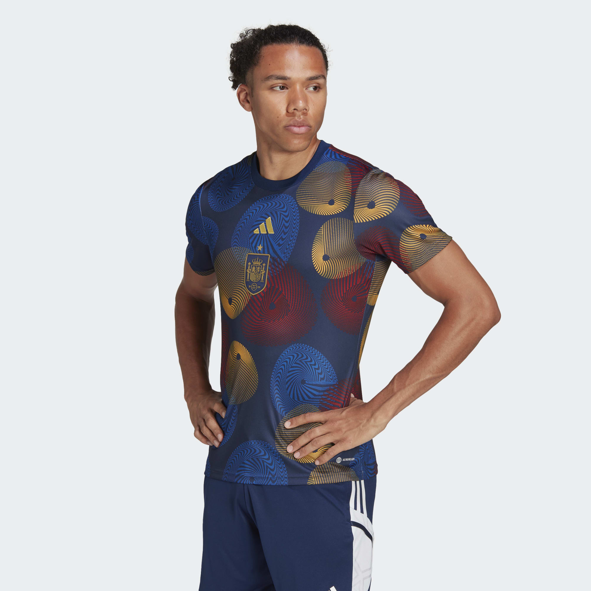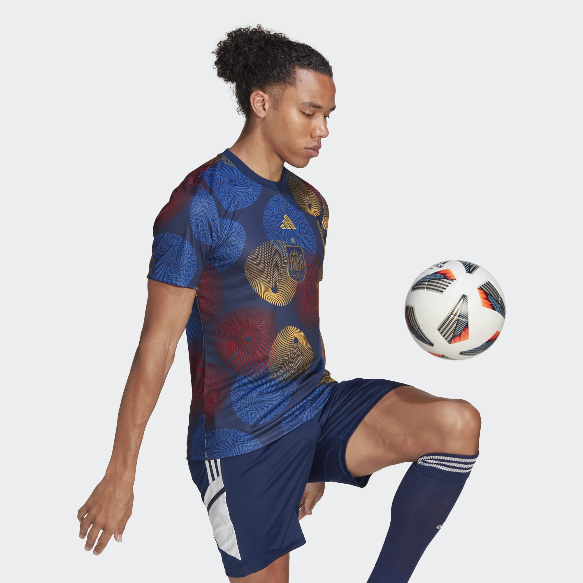 Spain players stand out before games as they complete their last-minute routines in this eye-catching Spain 2022 adidas Pre-Match jersey.