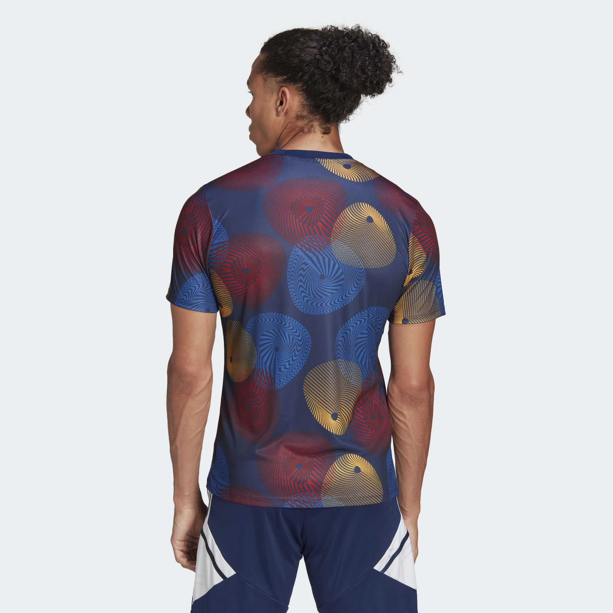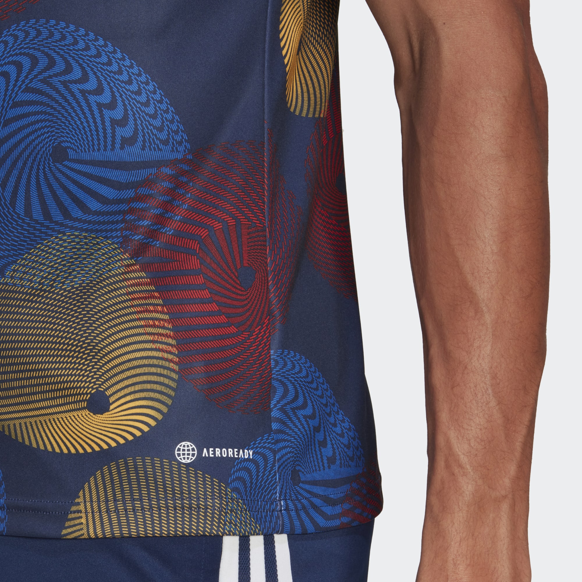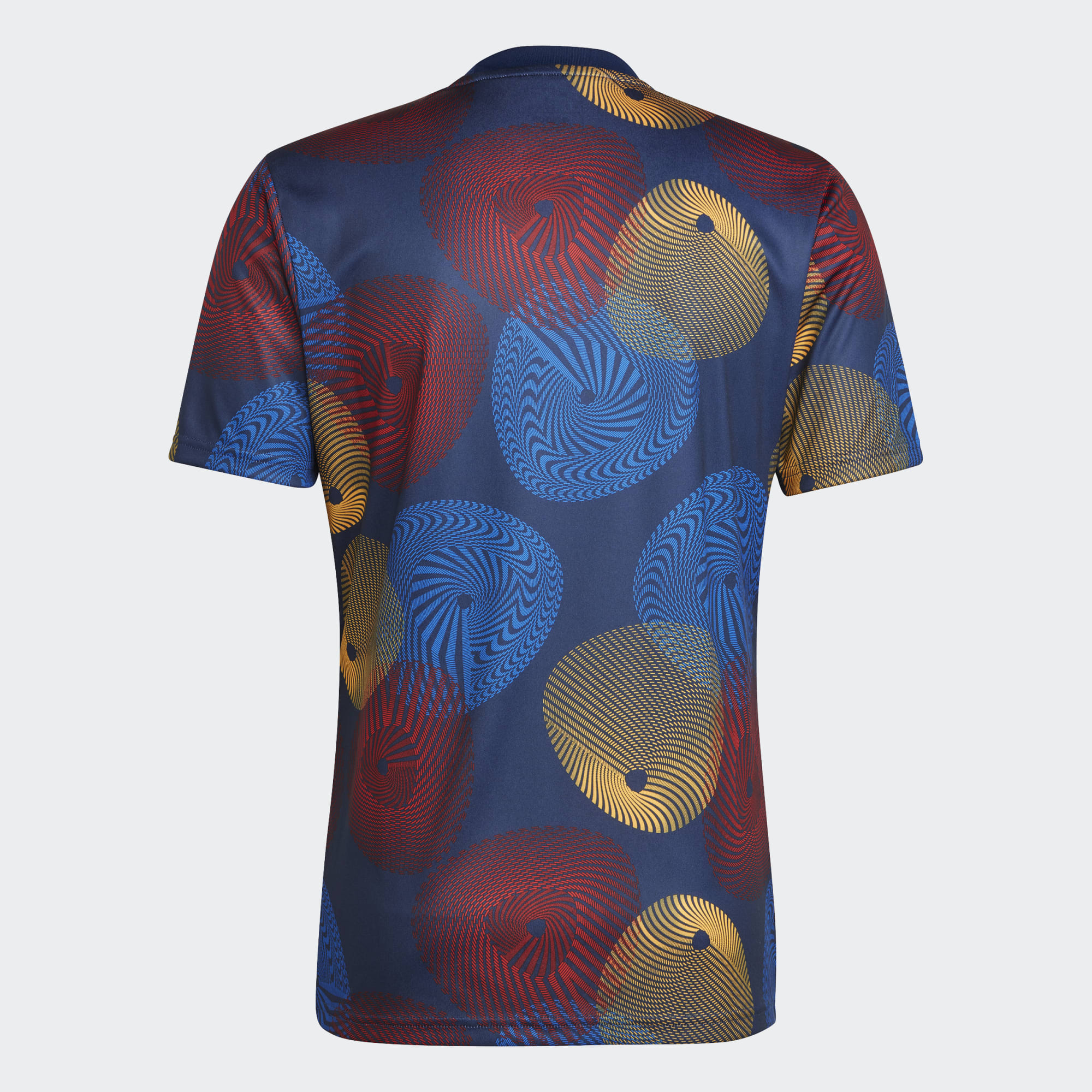 Spain players stand out before games as they complete their last-minute routines in this eye-catching Spain 2022 adidas Pre-Match jersey.