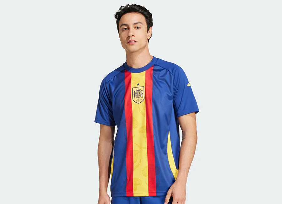 The adidas warmup shirt is in “Victory Blue” with a vertical stripe in the style of Paris Saint-Germain’s “Hechter” and resembling the Spanish red-and-yellow national flag turned 90 degrees.