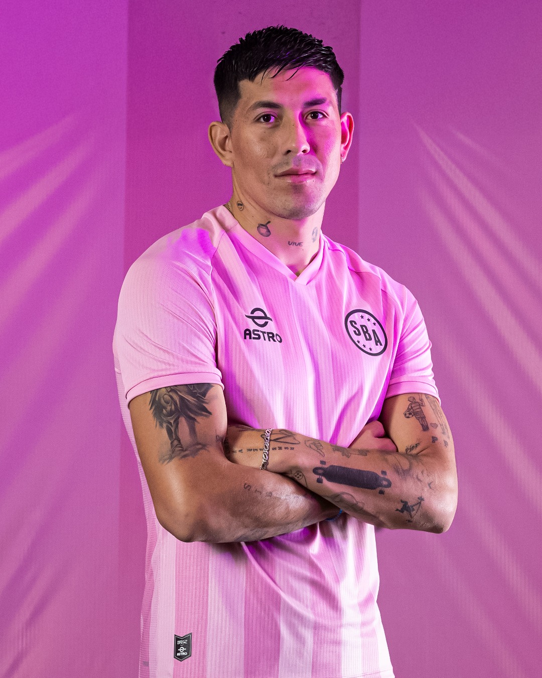 A V neck collar is used, constructed in matching pink tones and finished with reinforced stitching around the neckline. The Astro logo appears on the right chest, while the Sport Boys crest is positioned on the left. Additional details include a “Desde 1927” inscription placed high on the upper back below the collar, referencing the club’s founding year. Near the lower hem, the phrase “Un amor para toda la vida”, meaning “A love for a lifetime”, is printed alongside an infinity symbol. An Astro authenticity badge is also applied near the base of the shirt, confirming its official status.