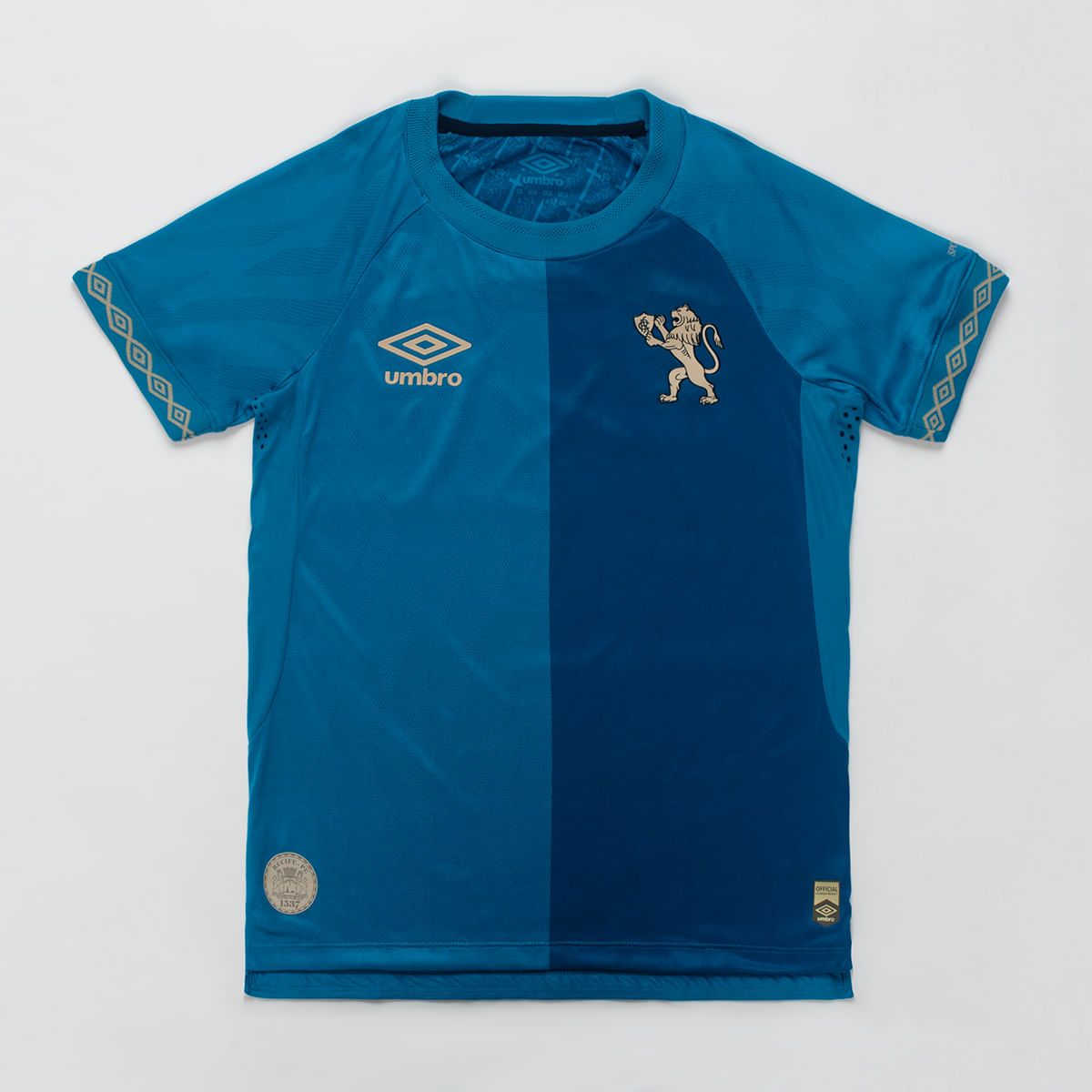 The Umbro shirt features two tones of blue in a half-and-half arrangement on the front panel, with a golden outline of the lion replacing the usual crest, while additional detailing includes the Umbro double diamond on the chest and patterned sleeve trims in gold.