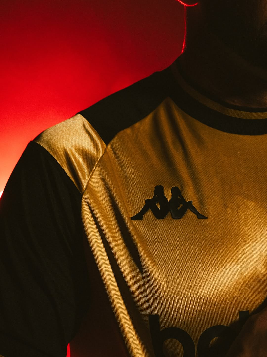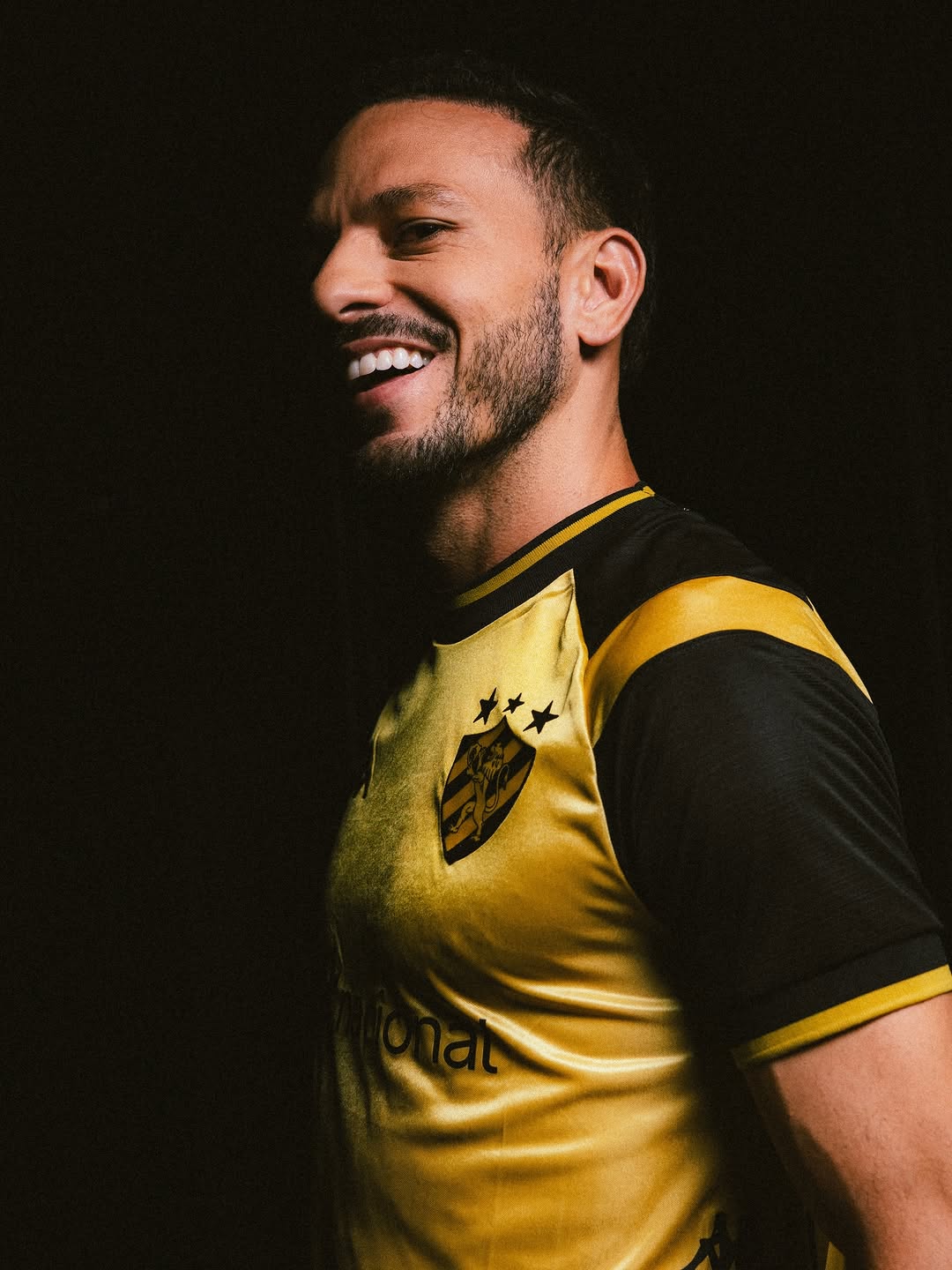 The new Sport Recife jersey is presented in a metallic gold base colour, combined with contrasting black sleeves and shoulder panels. A ribbed crew neck collar in black includes a thin gold stripe, matching the trim that appears on the sleeve cuffs.