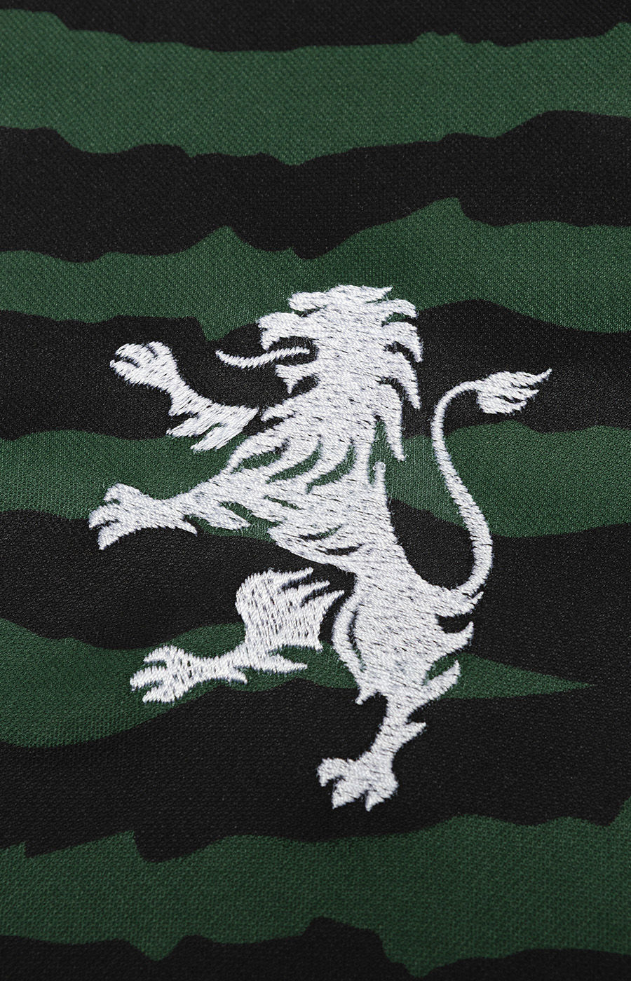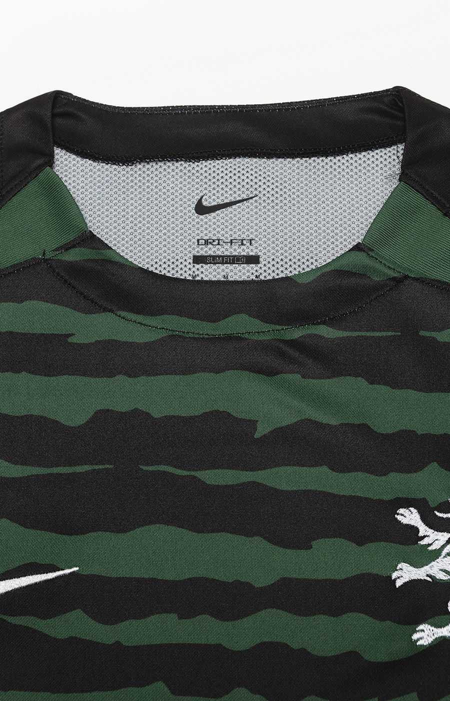 Black sleeves sit alongside green trimmed cuffs. The neckline follows the standard Nike Dri Fit construction with a black collar and breathable mesh panel on the inside. Mesh fabric also features across the upper back for ventilation, leading into the continuation of the pine green pattern on the lower section.