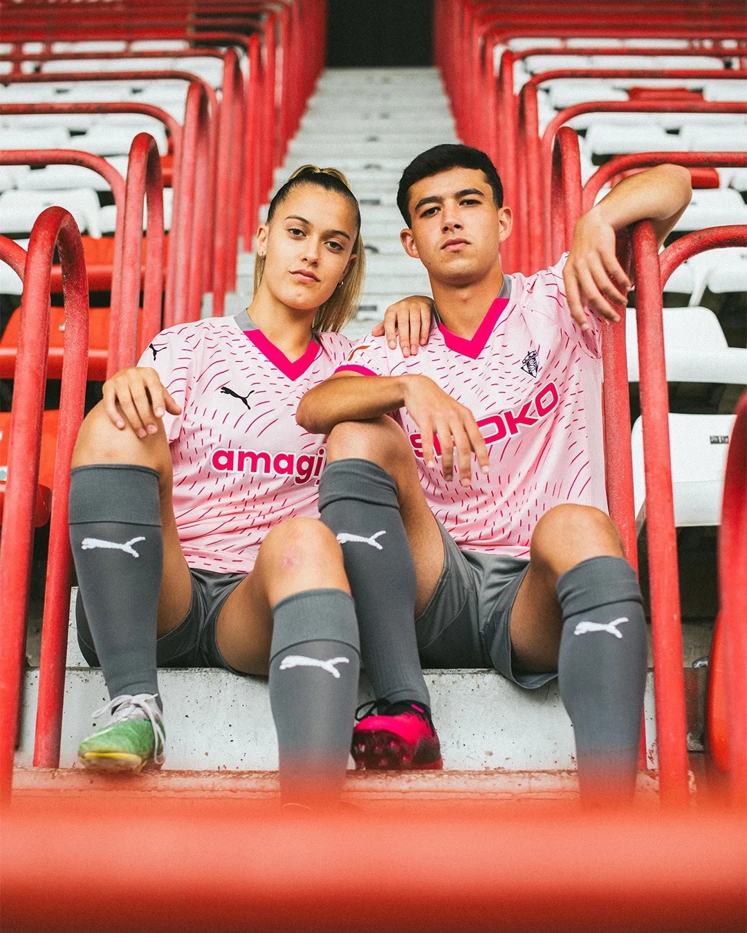 The Puma jersey features a pink base with fuchsia highlights on the sleeves and collar, complemented by grey shorts and socks. Grey also appears as a detail on the collar.