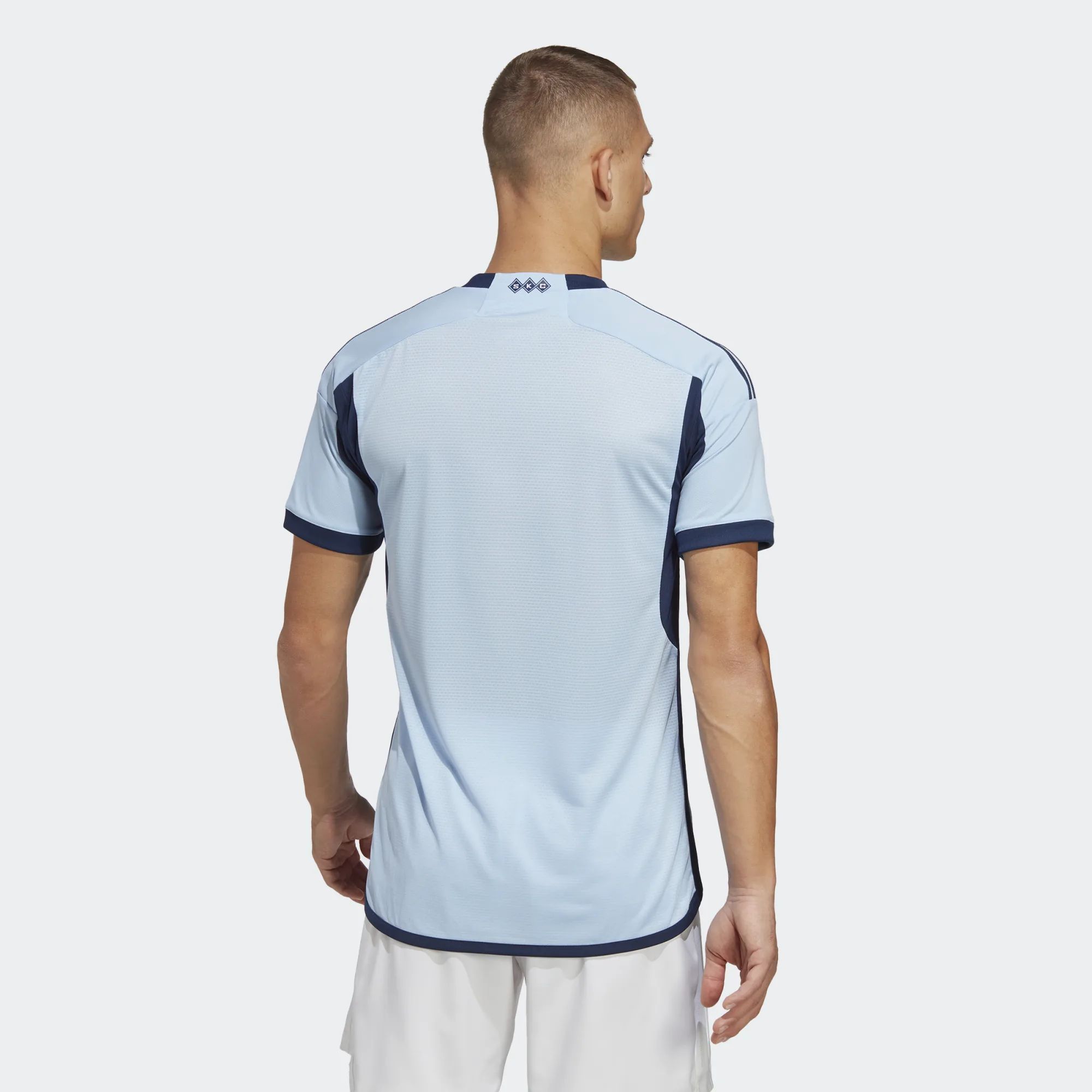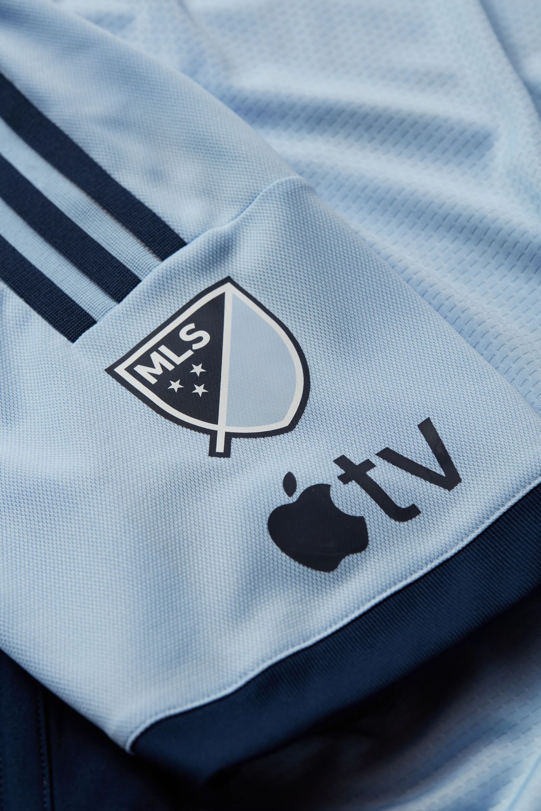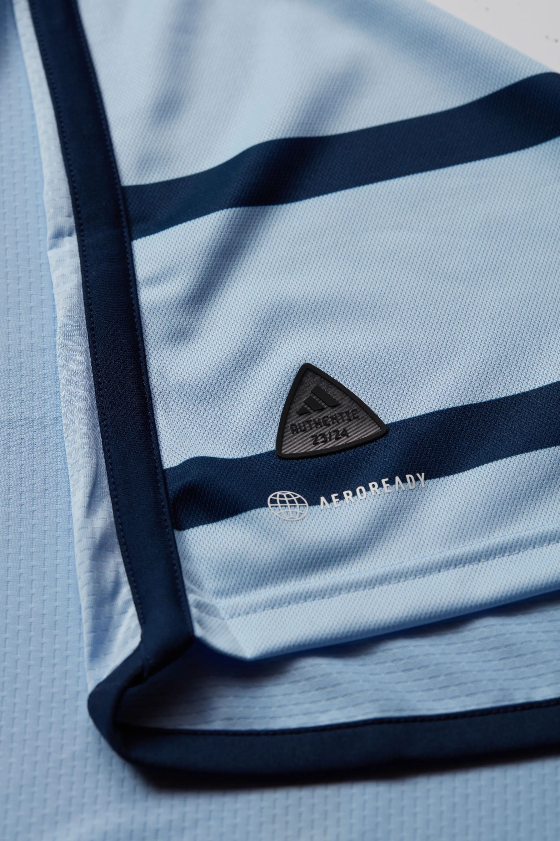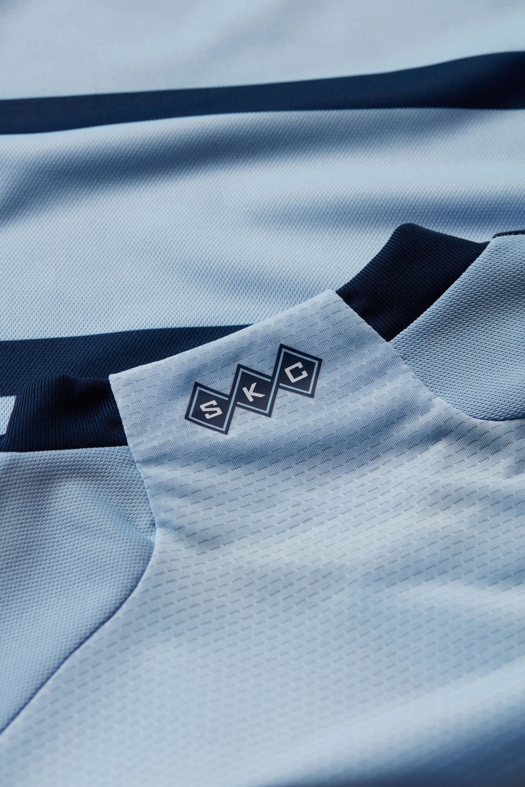 The latest jersey features thin Dark Indigo horizontal stripes, reminiscent of the memorable kits worn in 2016-17, and Dark Indigo trim around the neck, sleeves, and sides. The Sporting Blue shorts and socks complement the new primary jersey and can be interchanged with Dark Indigo shorts or socks.