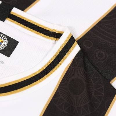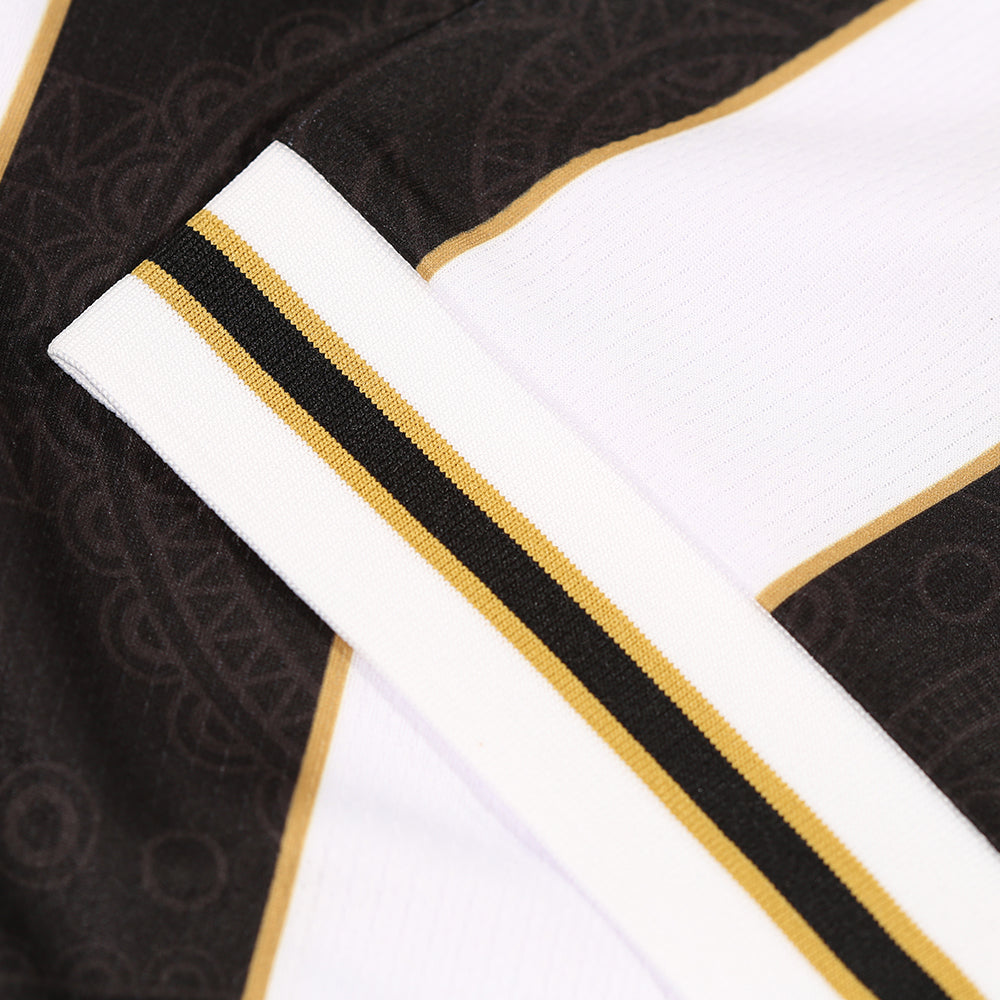 The 2024-25-season primary release sees the famous black and white stripes divided with slivers of gold and with the darker portions of the design, not for the first time, boasting a “paisley”-patterned fill.