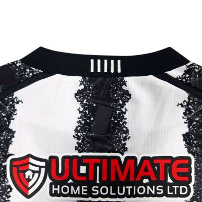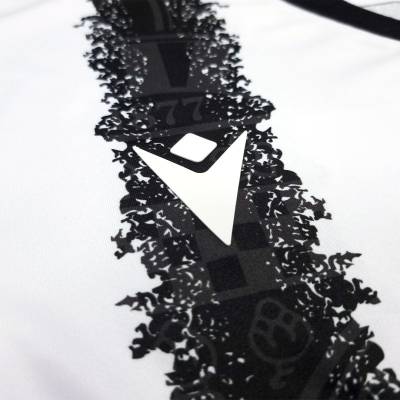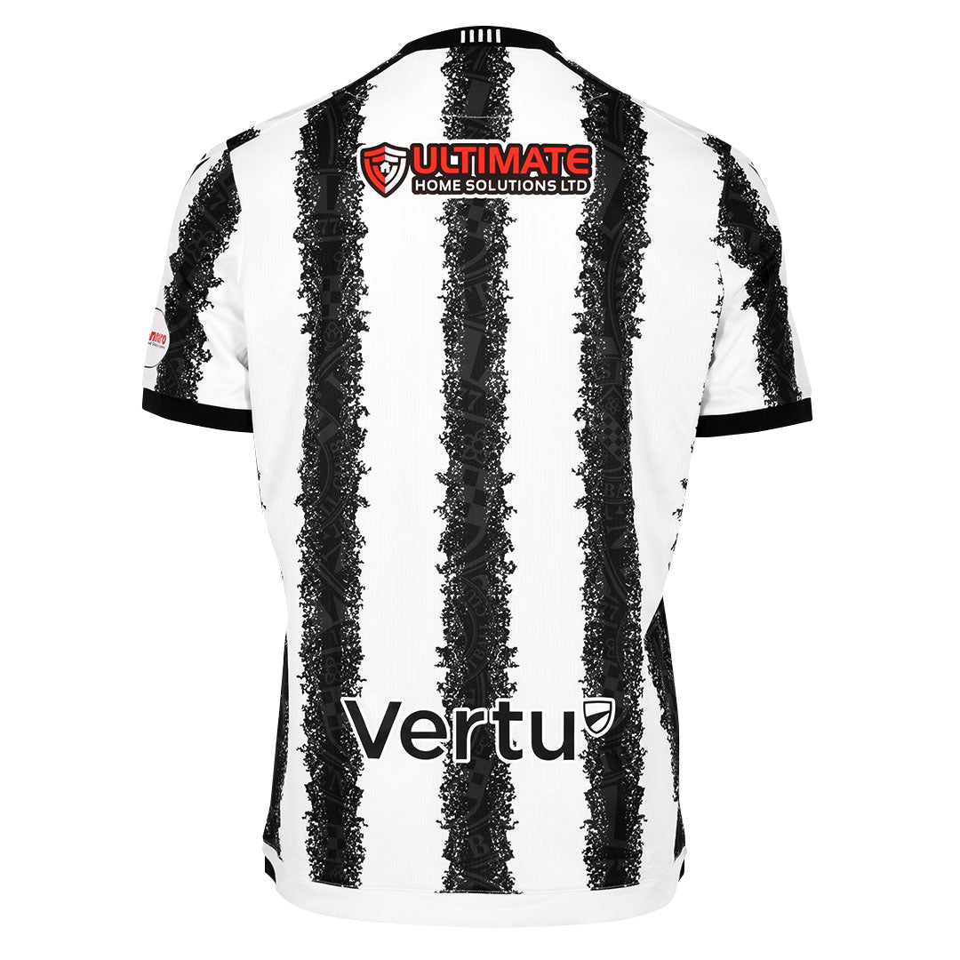 The shirt retains the club’s traditional black and white stripes, reimagined in a textured pattern that references the town’s historic Paisley design.