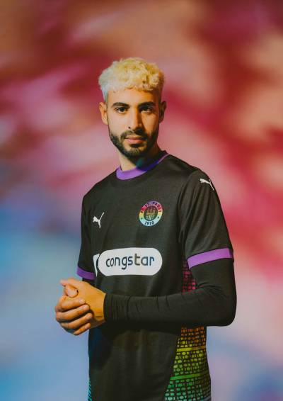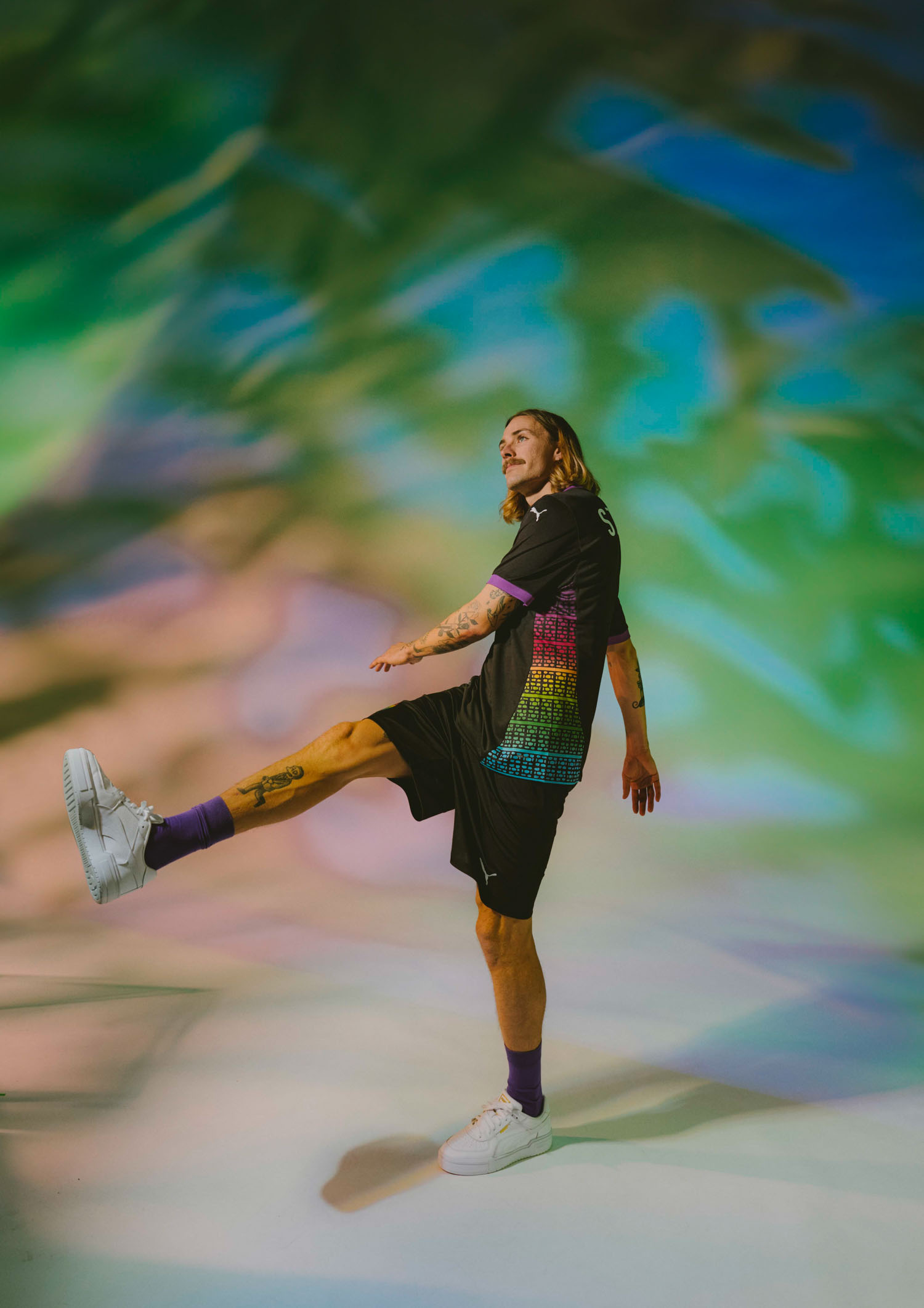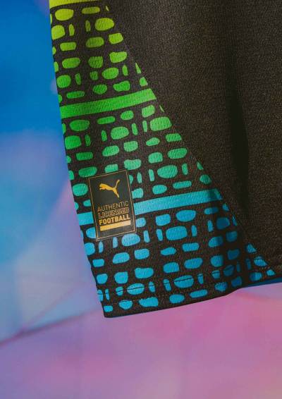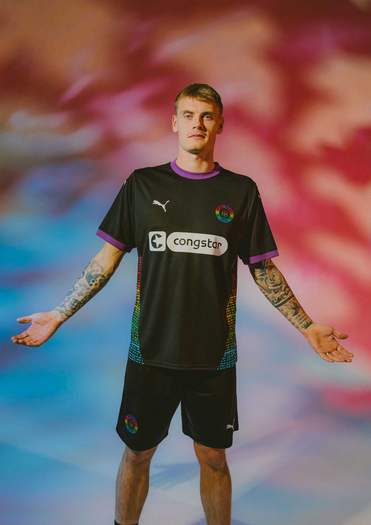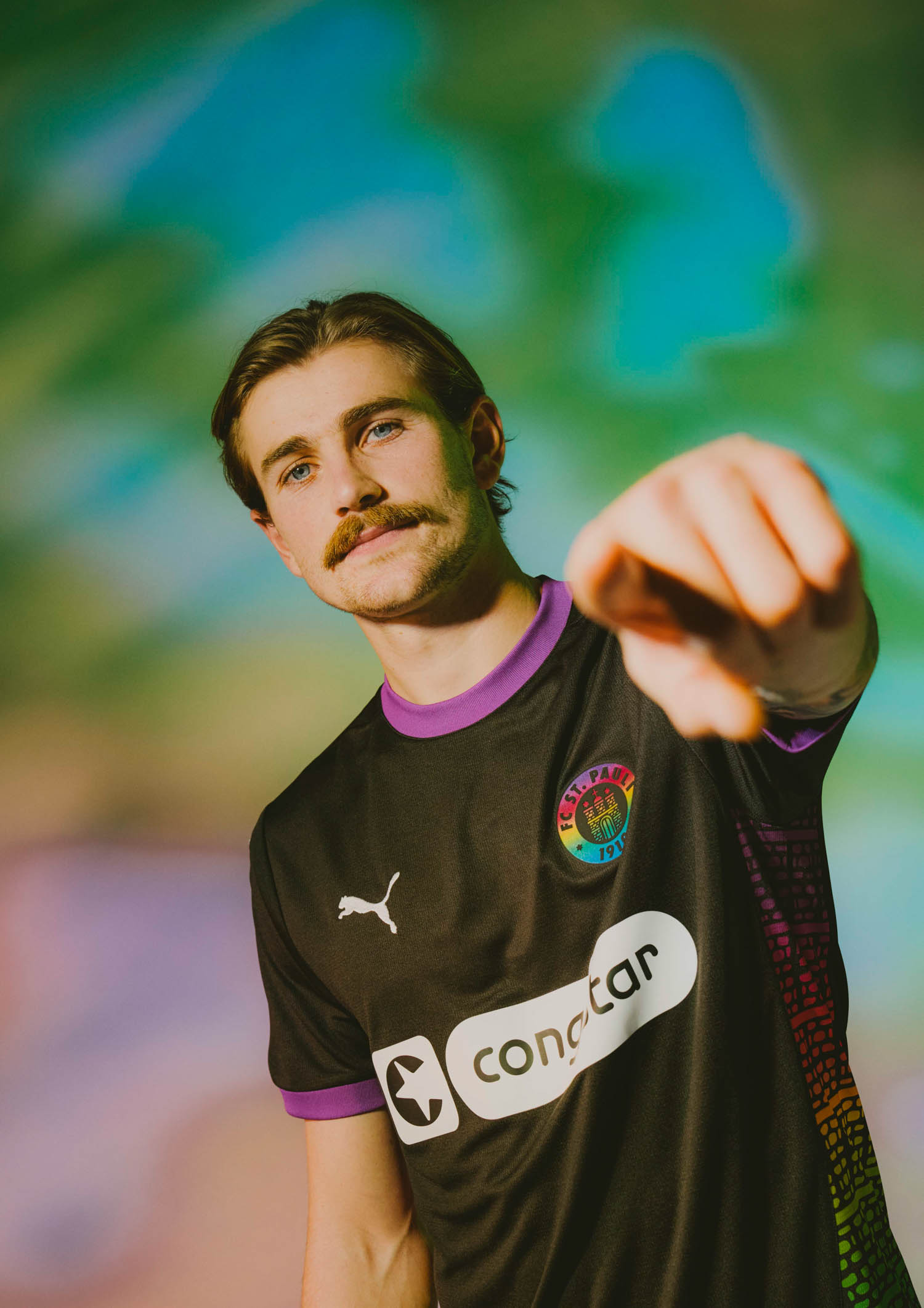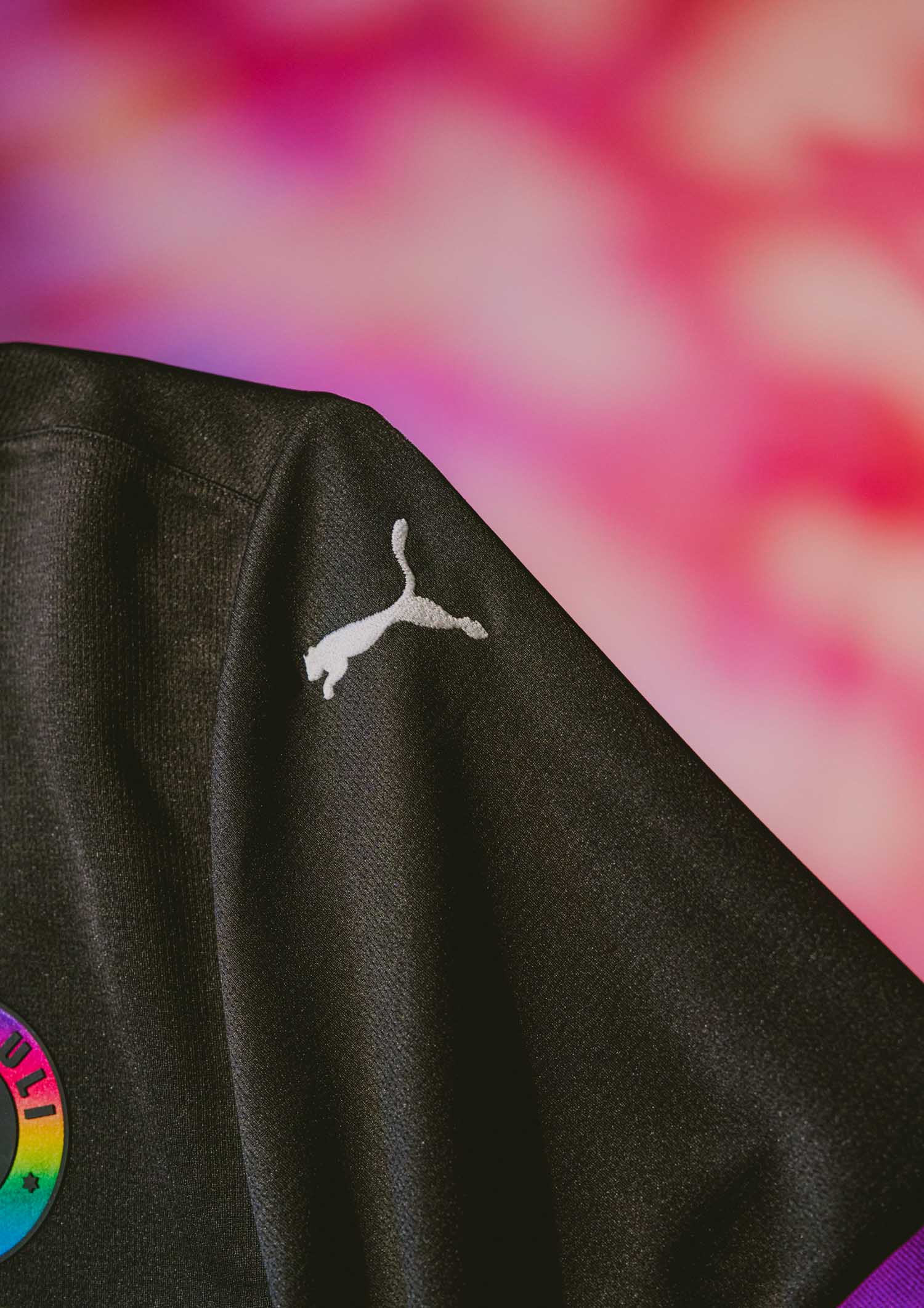 The Puma secondary change for the Hamburg-based side is in black with purple neck and cuffs and very on-brand rainbow-coloured crest and side panels.