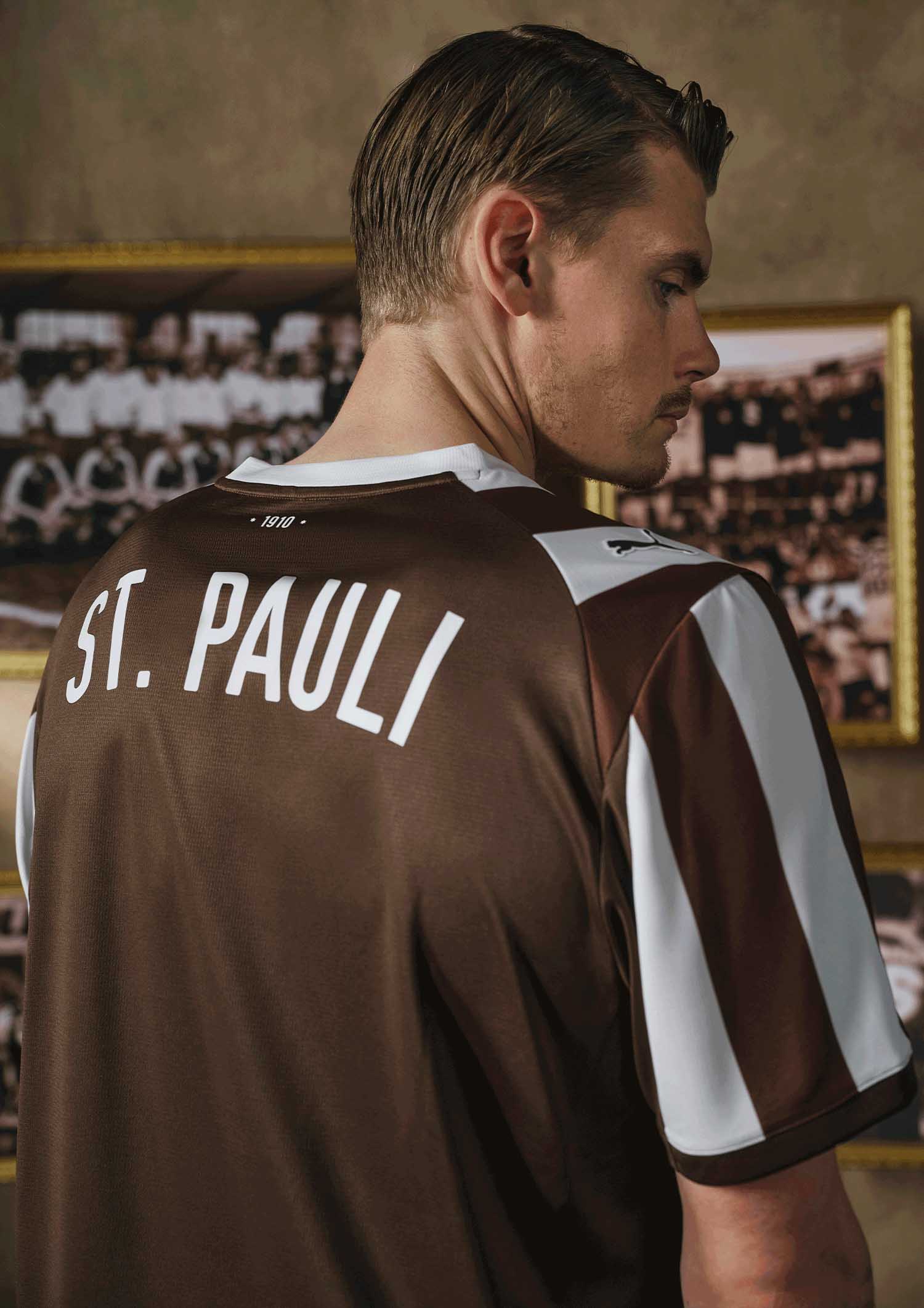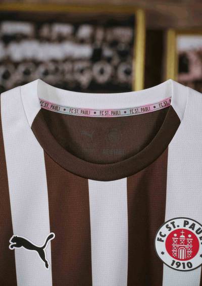 FC St. Pauli have released their 2025–26 Home shirt in collaboration with Puma, which features brown and white vertical stripes.