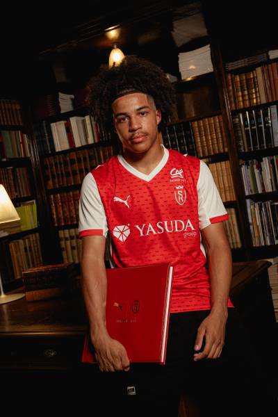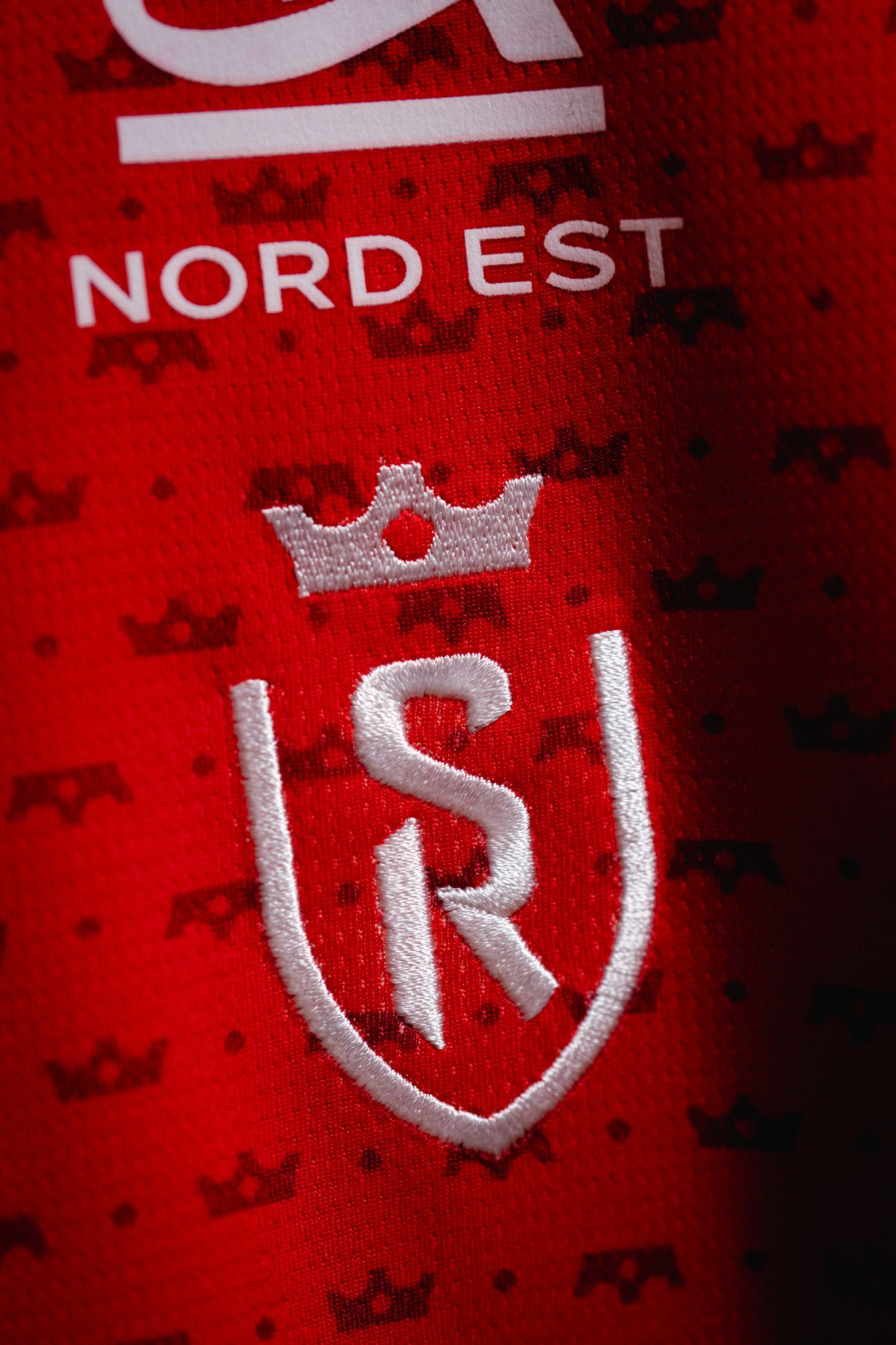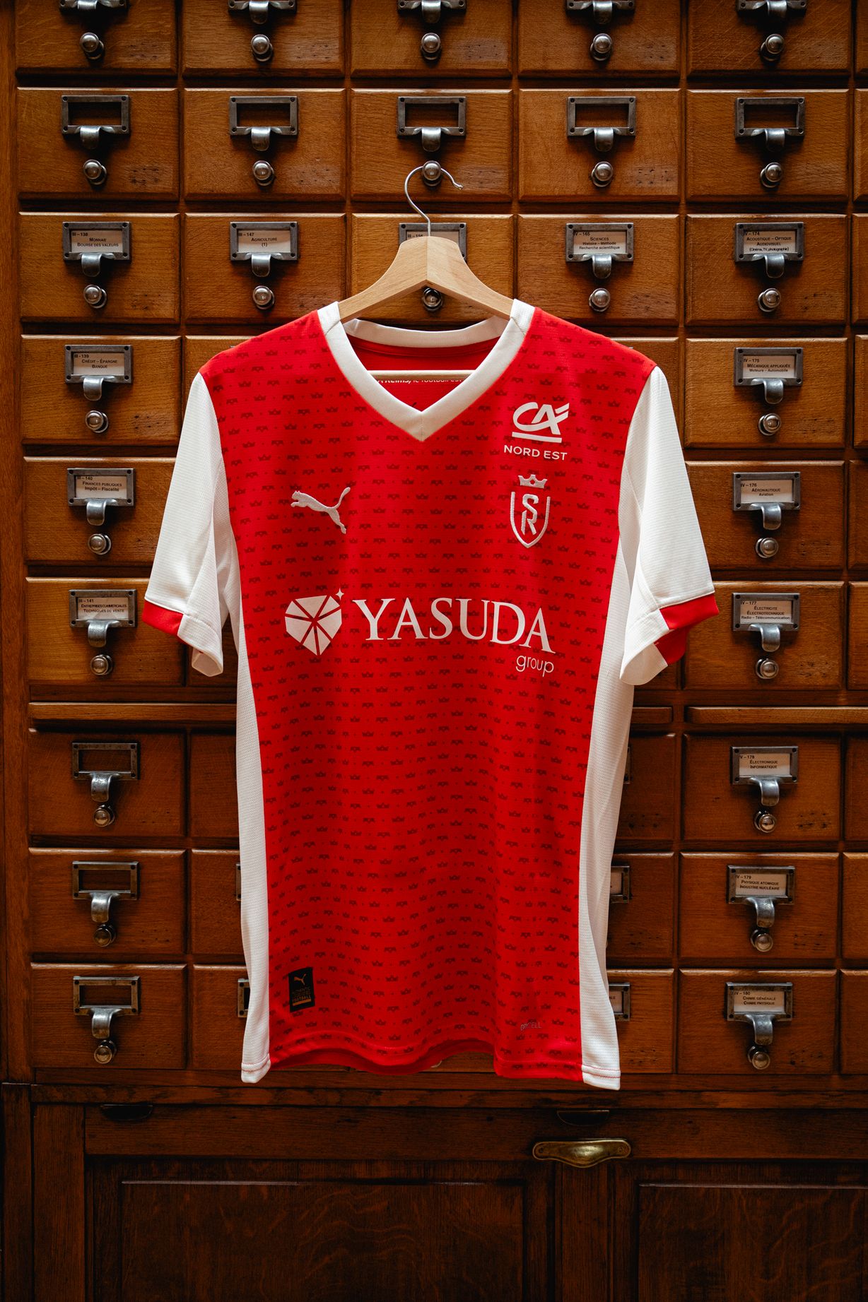 The new shirt includes a white V neck collar and white sleeves finished with red cuffs. The club crest, Puma logo and main sponsor Yasuda appear in white on the chest, with the CA Nord Est sponsor sitting above the crest. Inside the collar, a signature detail reads “À Reims, le football est roi” – football is king in Reims.