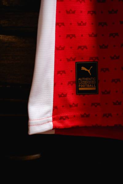 The shirt retains the club’s traditional red and white colour scheme, with a design that features a tonal crown motif repeated across the front.
