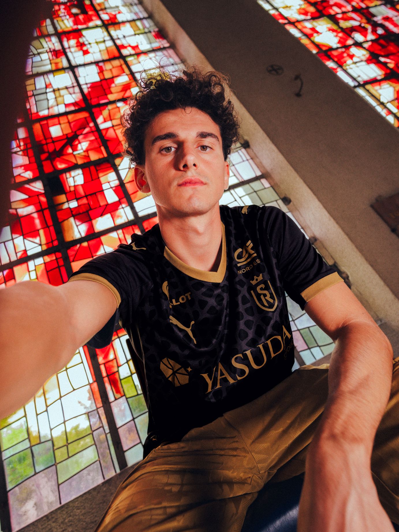 Across the front is a pattern inspired by the stained-glass windows of Reims Cathedral, reflecting the precision and artistry of the city’s glassmakers. The club crest and Puma logo also appear in gold, while the main sponsor Yasuda Group features prominently on the chest.