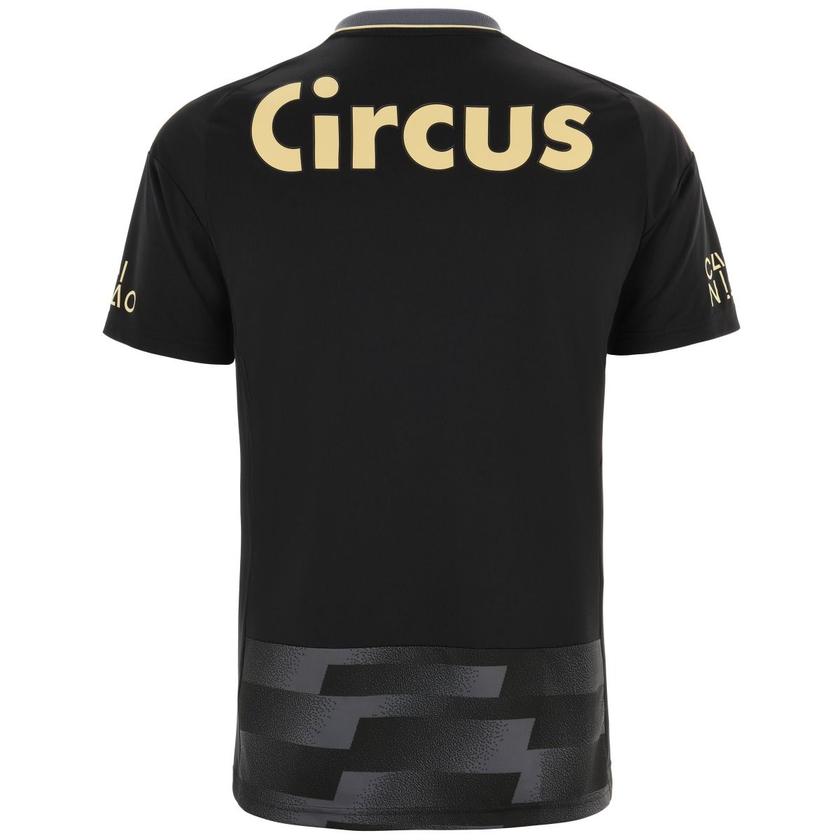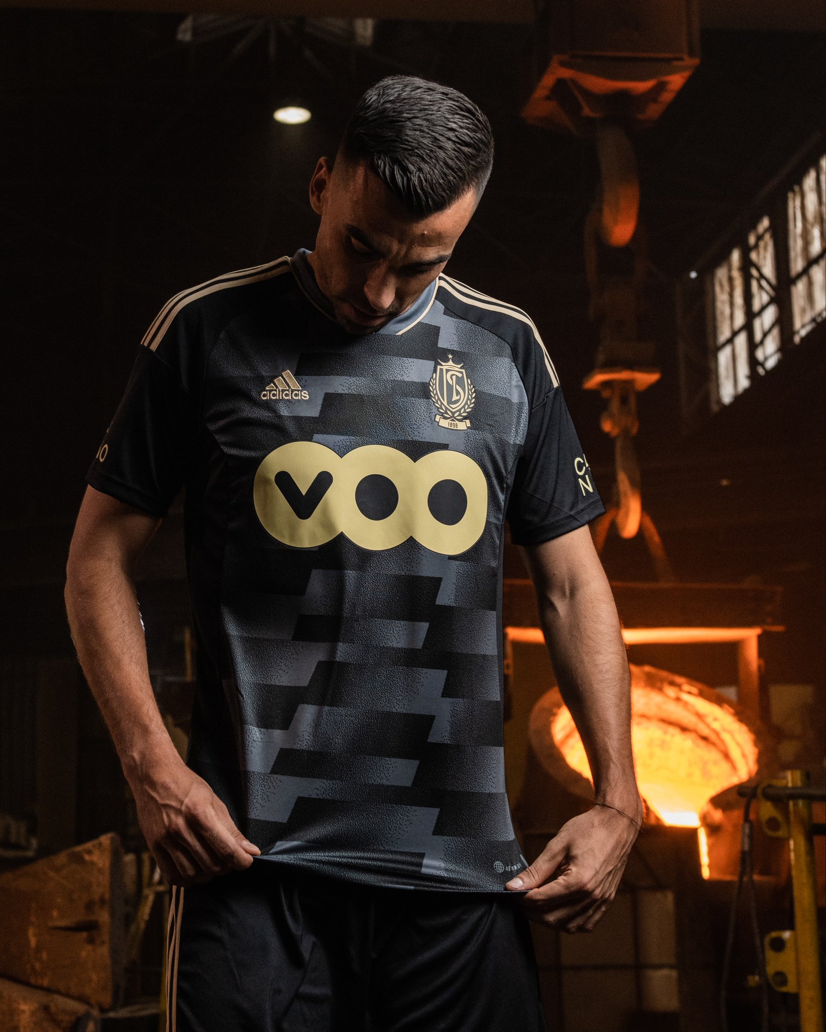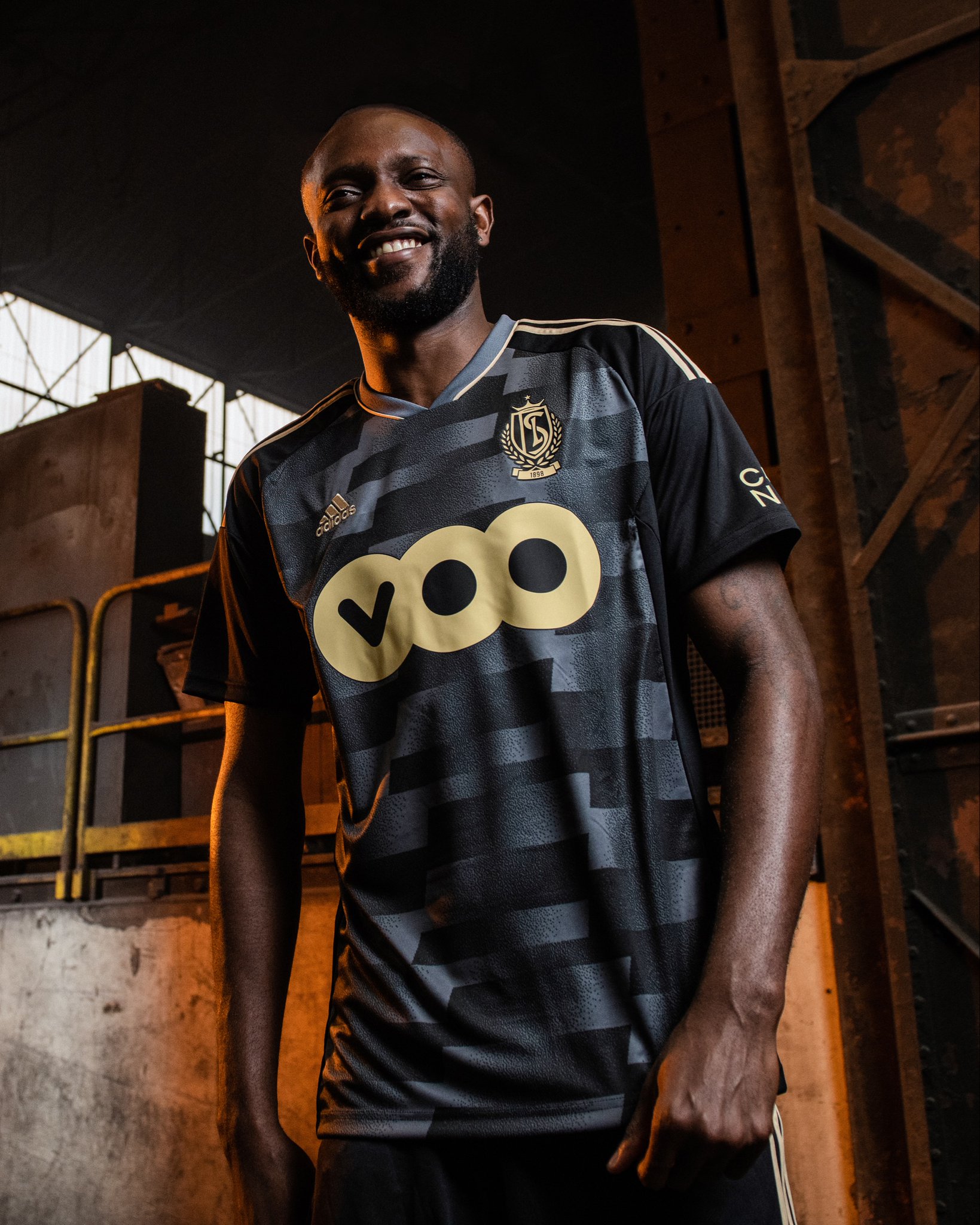 The adidas primary-change design for the Belgian Jupiler Pro League side has a greyscale trunk with gold detailing and black sleeves.