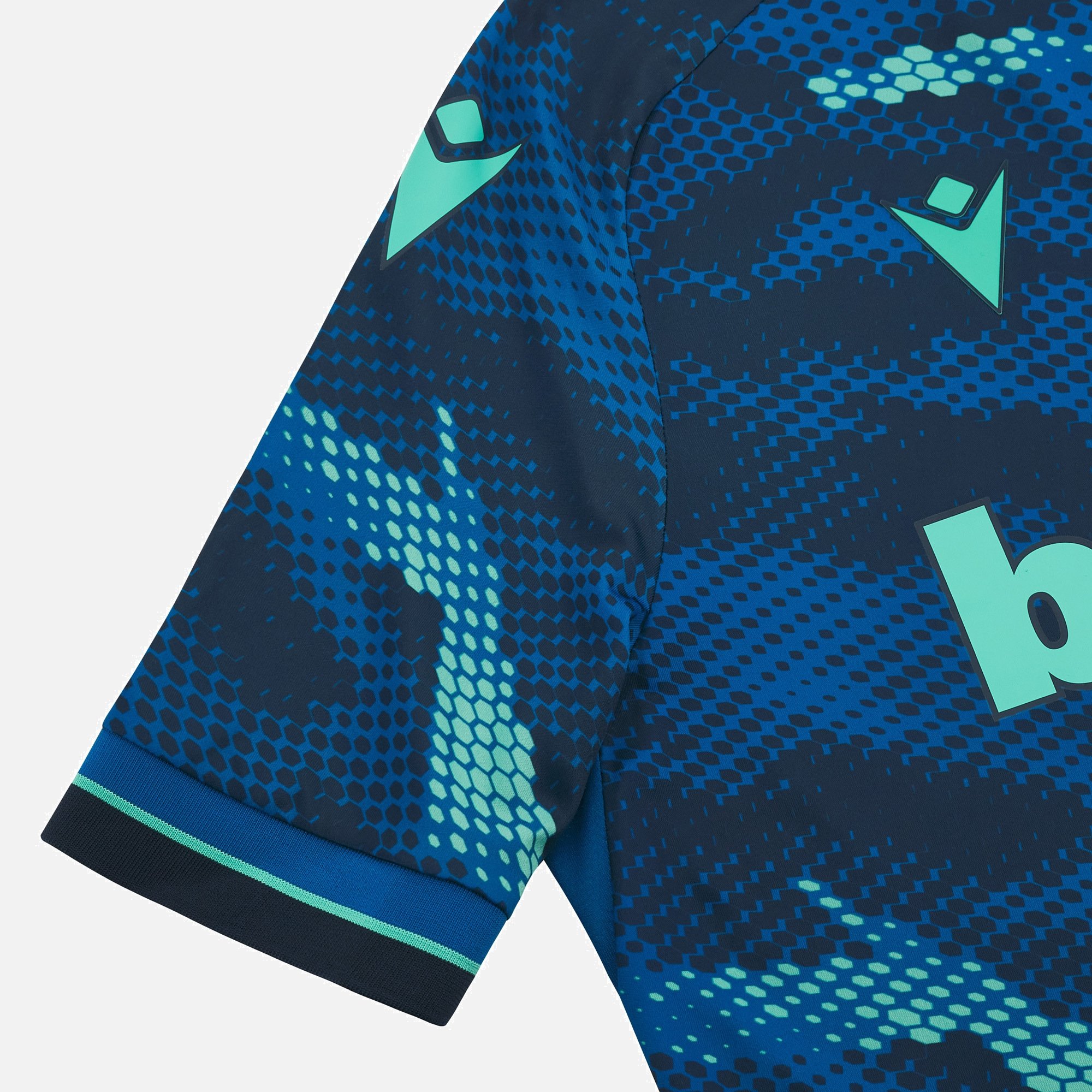 The sleeve rib knit cuffs combine navy and royal blue with a thin turquoise line. The inside neck label is customised with the kit colours, crest, Macron logo, and the phrase "Designed in Bologna."
