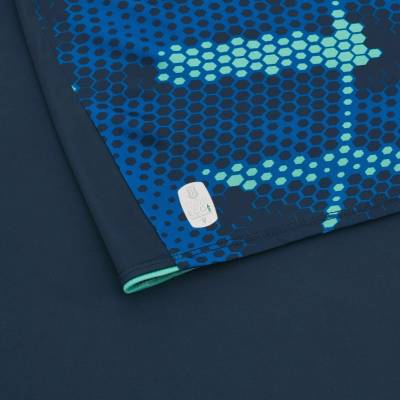 The kit showcases sublimated graphics in shades of navy blue to royal blue, with touches of turquoise, covering the entire front of the shirt and shoulders.