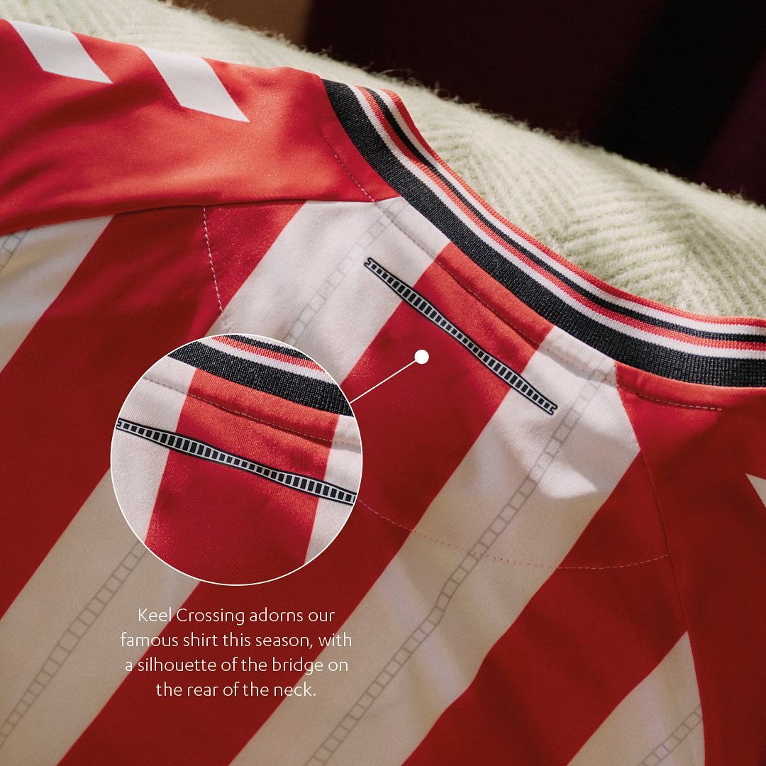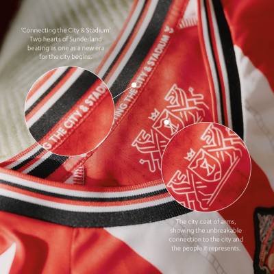 The red and white striped shirt includes subtle vertical detailing within the white stripes, referencing the structure of the Keel Crossing bridge. A silhouette of the bridge is placed on the back of the neck, while the inner collar is printed with the message “Connecting the City and Stadium” to symbolise unity between the club and the wider Sunderland community. The city’s coat of arms is also printed inside the collar.