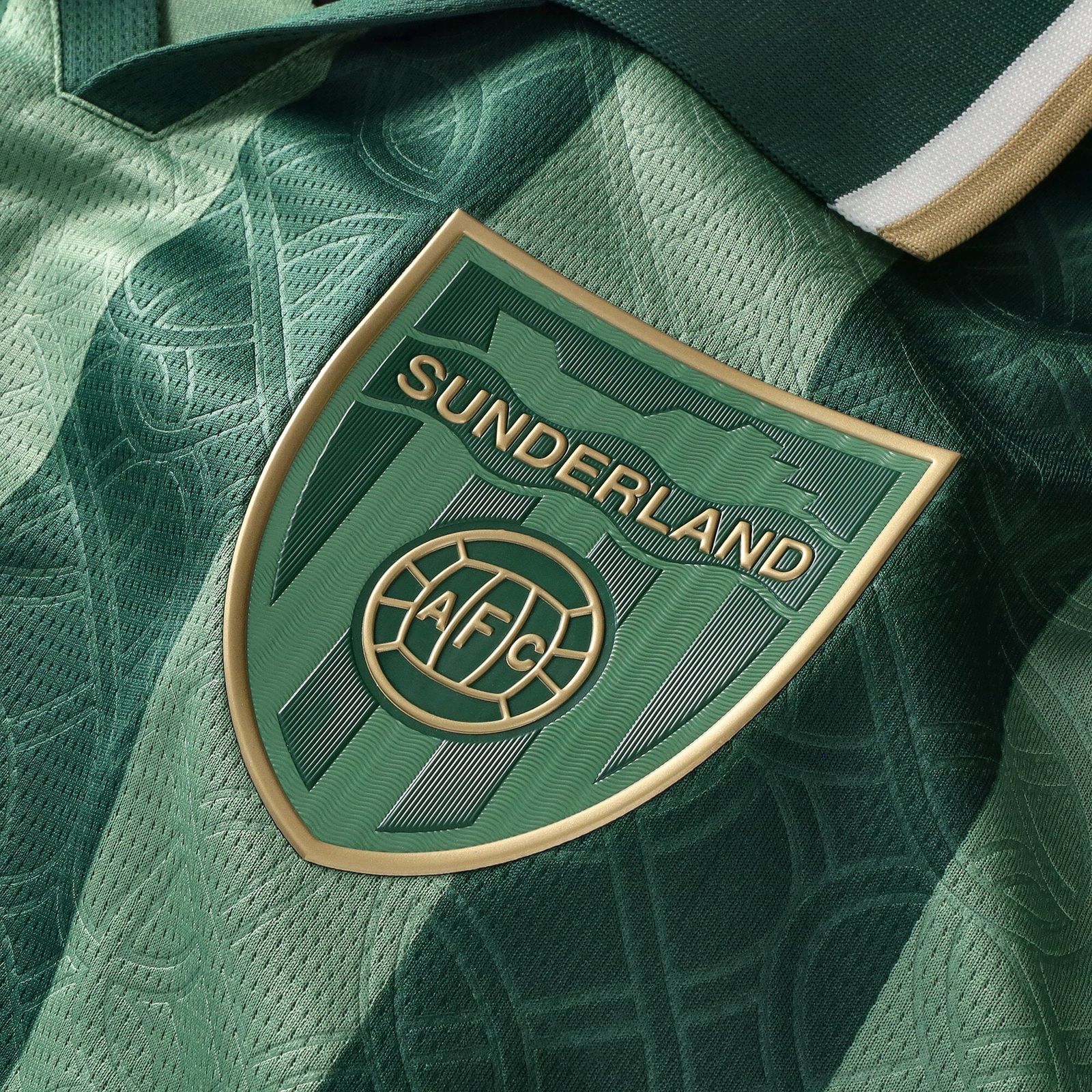 On the chest, a monochrome Sunderland crest appears in green and gold, positioned opposite a gold shamrock emblem. Inside the collar, additional detailing references the club identity, while a woven label is applied at the lower hem.