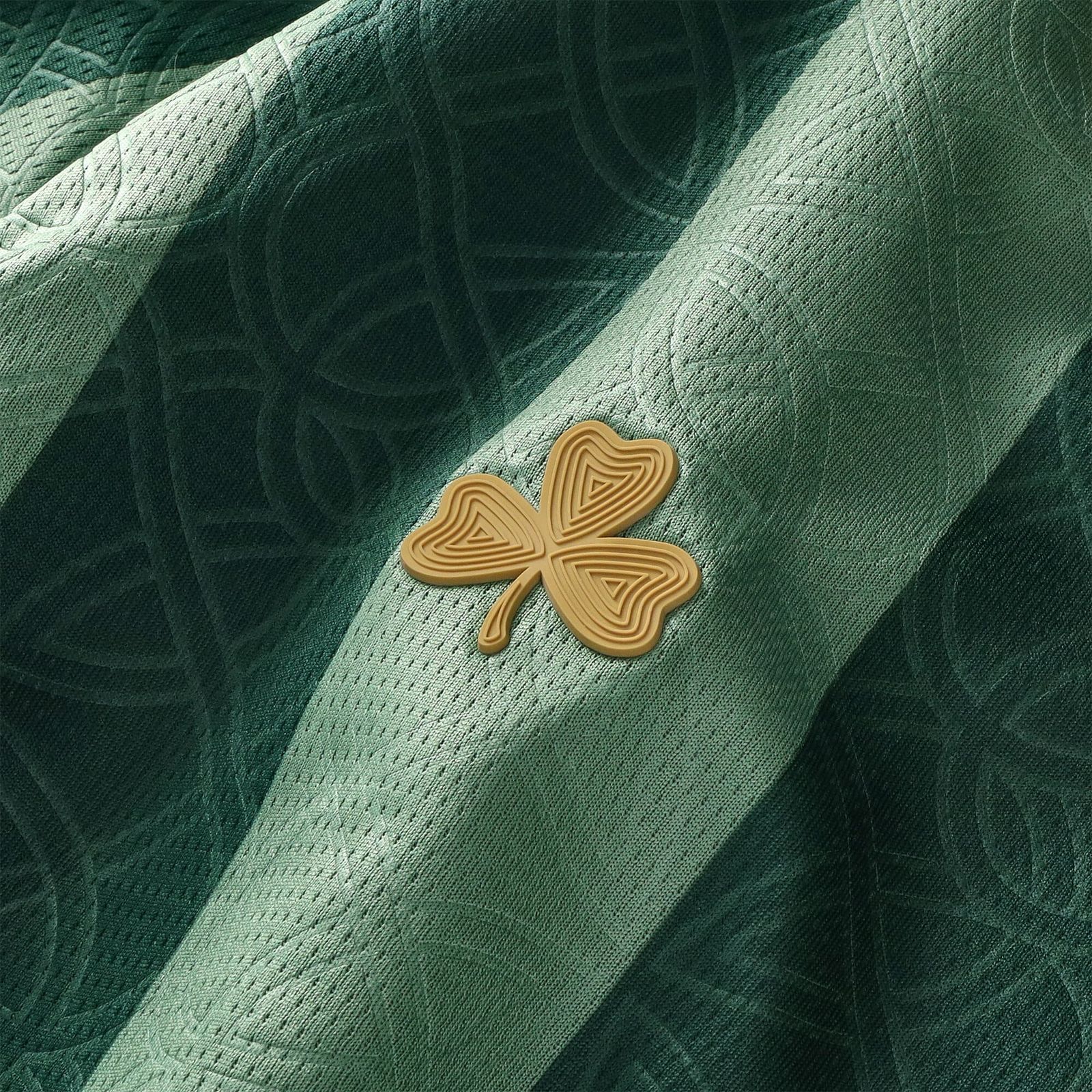 The Sunderland shirt is presented in two tones of green, arranged in alternating vertical stripes across the front, back and sleeves. Each stripe incorporates a tonal Celtic inspired pattern, creating layered surface detail across the body. The collar is fold over in dark green, finished with gold and white trim, and matched by coordinating sleeve cuffs.