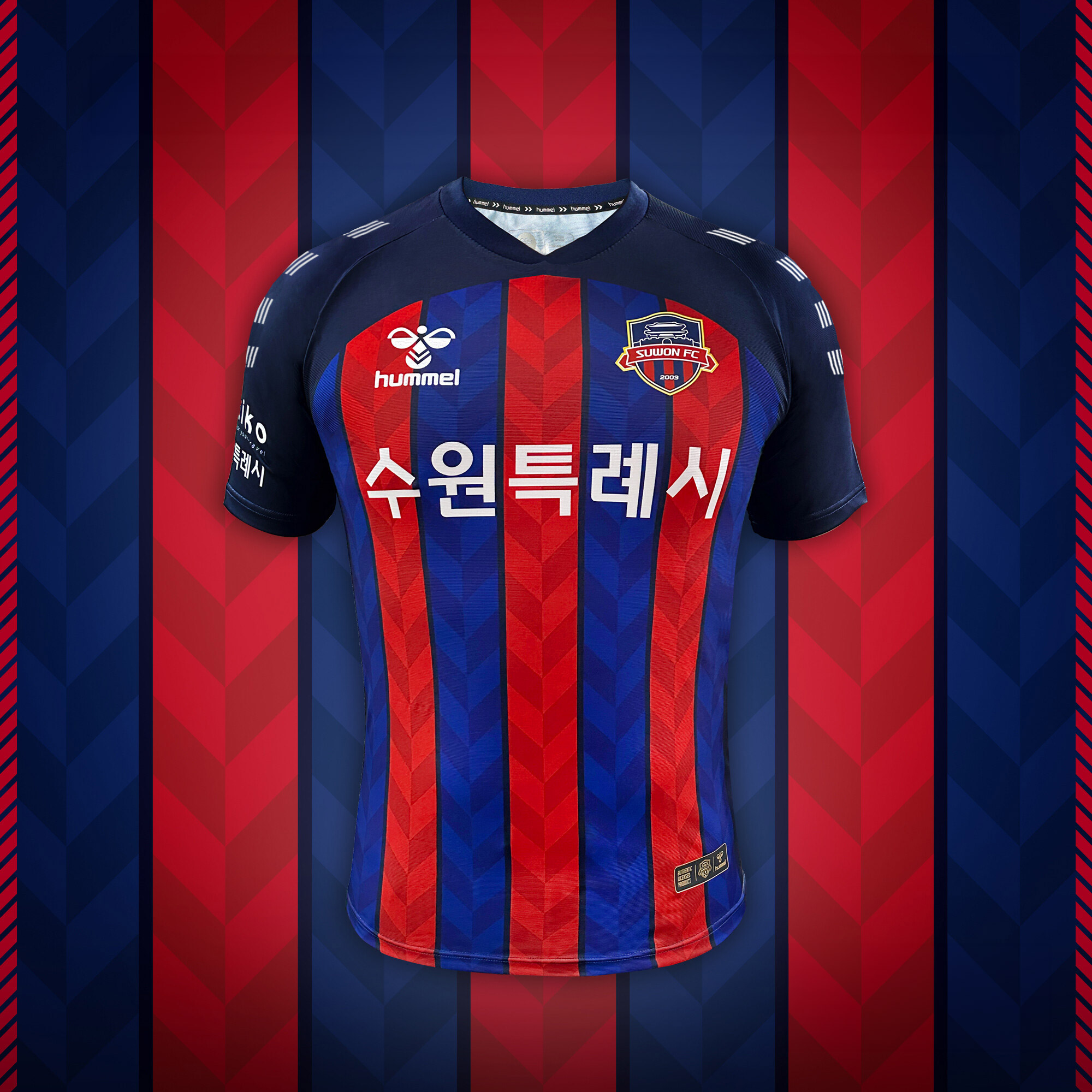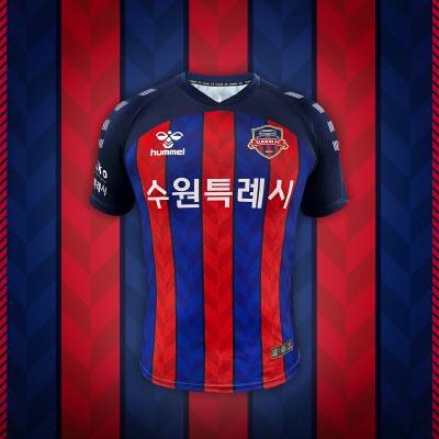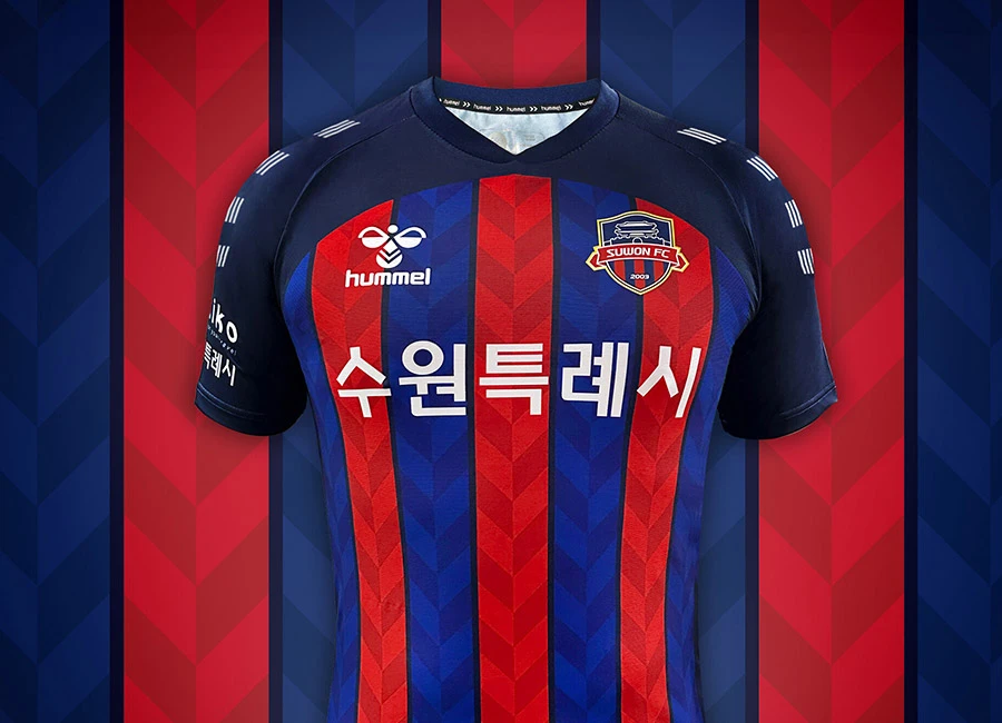The South Korean K League 1 side’s 2024 primary release is in tones of blue and red with a striped trunk also boasting ghost patterning and partner/sponsor logos - including the supplier’s famous chevrons - in white.