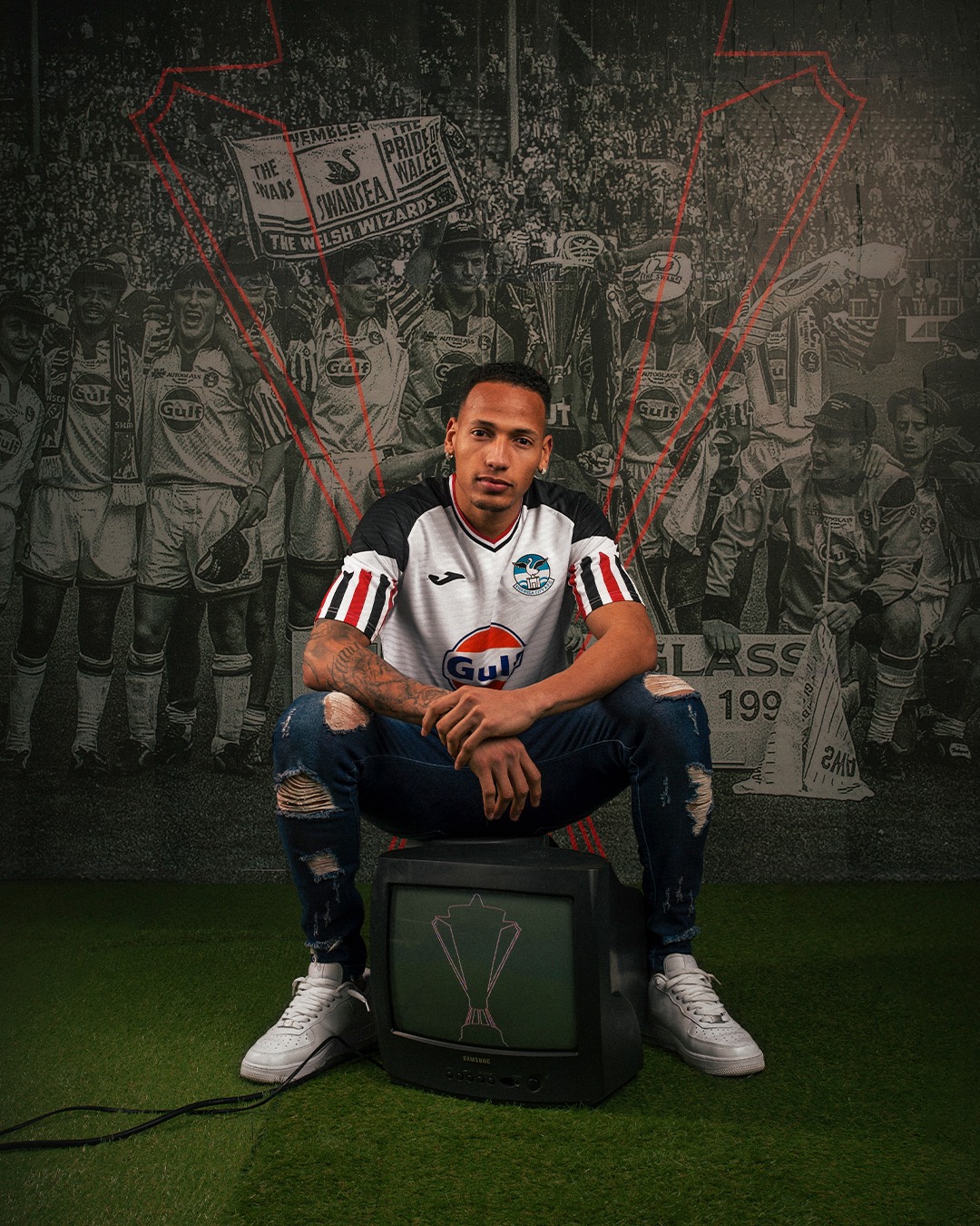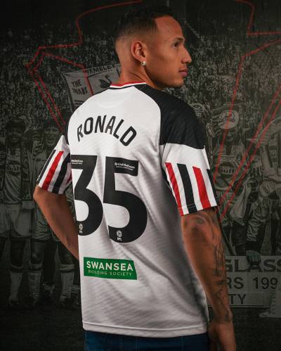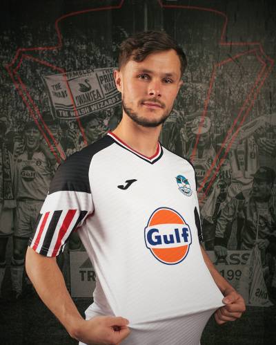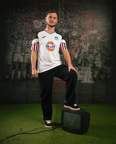 The nominally tertiary-change new Joma release for the Welsh EFL Championship side heavily references the Matchwinner shirt worn when the Swans won the Autoglass Trophy at the old Wembley Stadium in 1994.