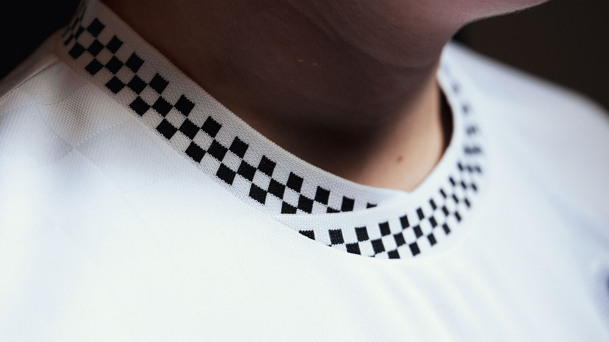 The shirt is white with a subtle sublimated check pattern on the front and sleeves, while a black and white chequered trim on the collar and sleeve cuffs references the club’s 1996–97 kit, worn during their Third Division play-off final run under Jan Molby.