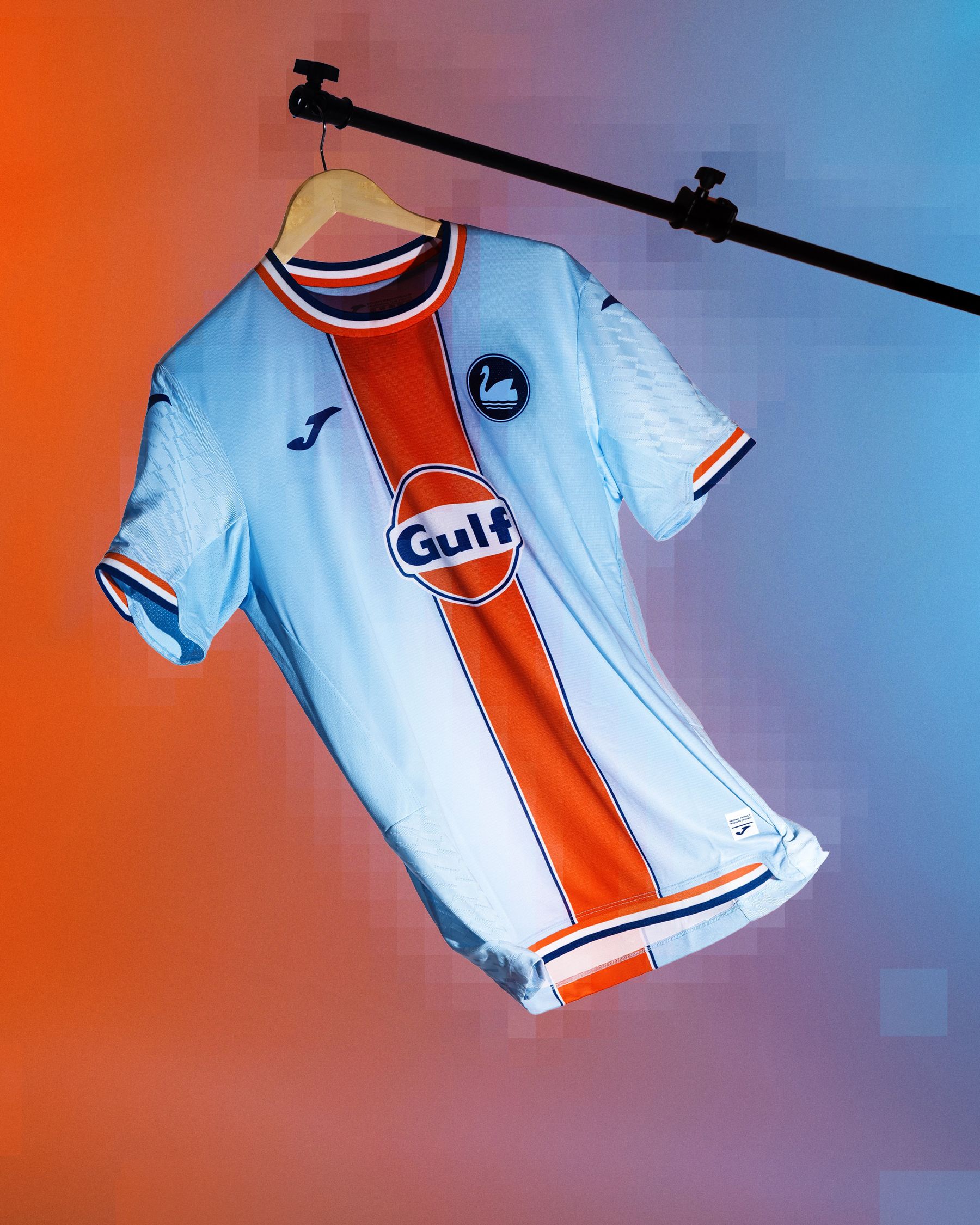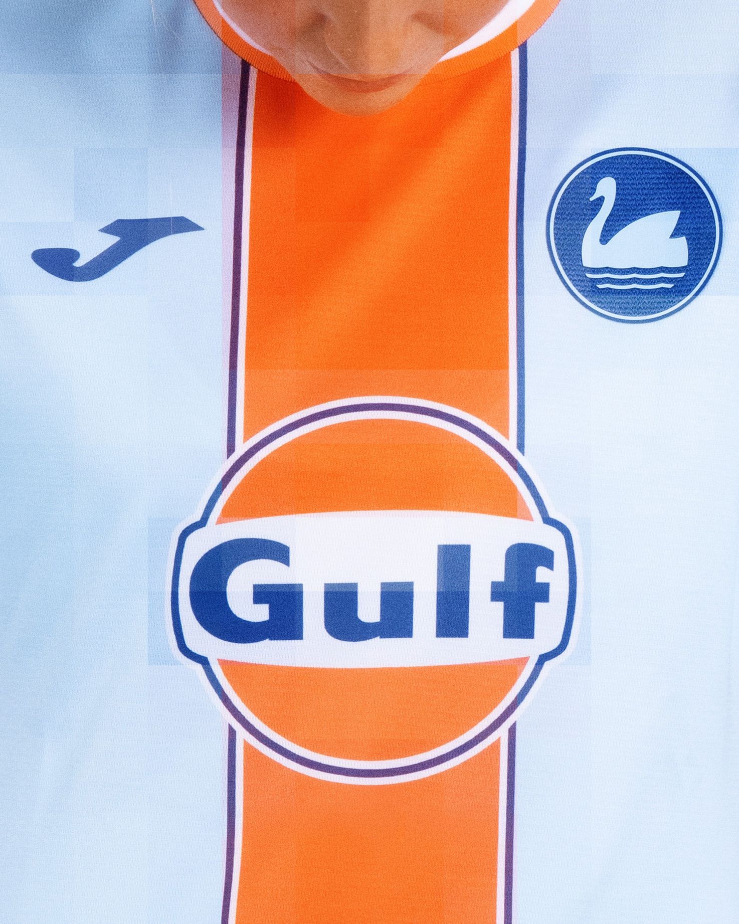 The design takes inspiration from famous Gulf motorsport liveries, most notably seen on the Ford GT40, Porsche 917 and McLaren F1 GTR. For Swansea fans, these colours also recall club kits worn in the mid-1990s, when Gulf first featured as sponsor.