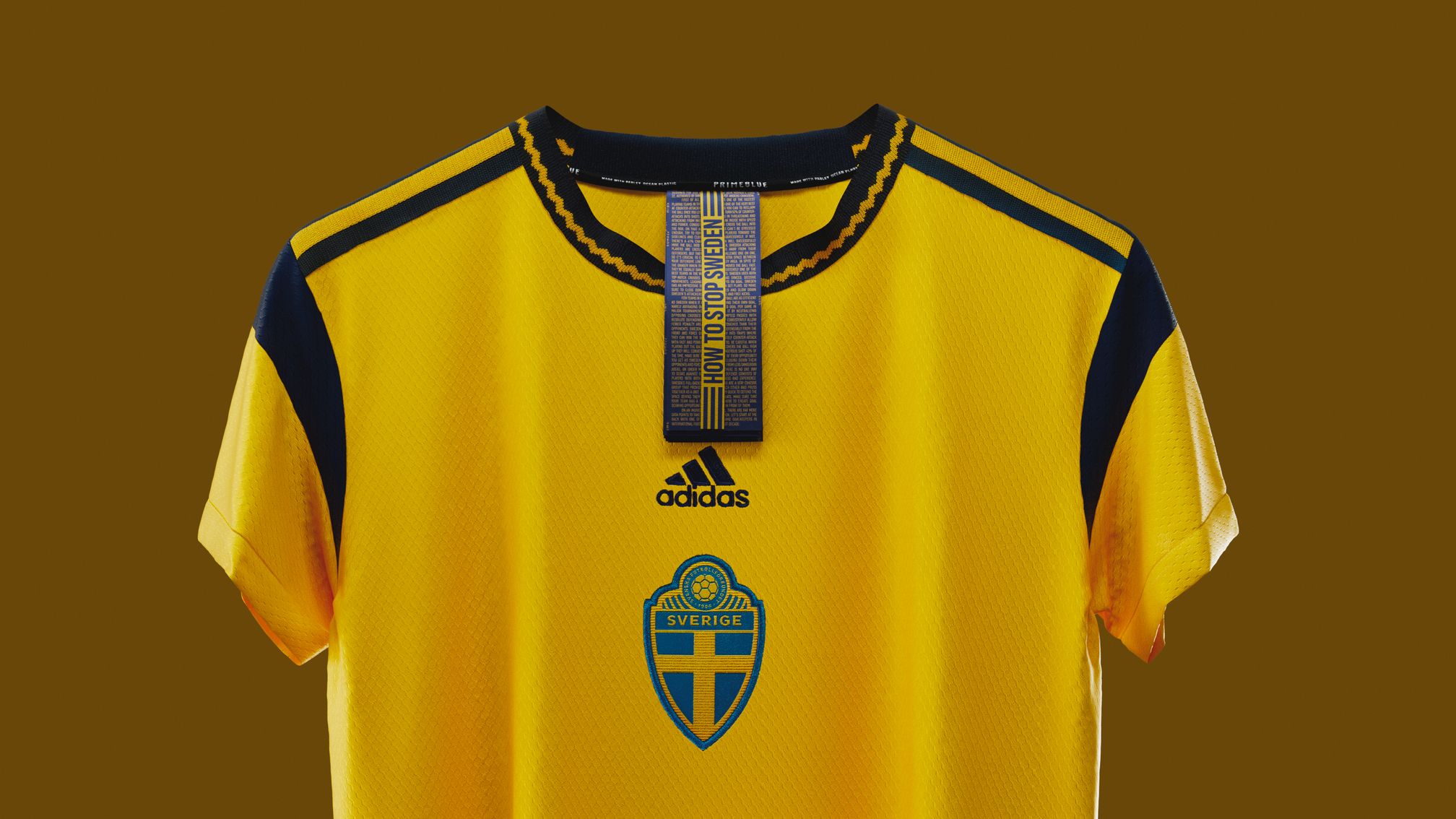 The shirt, featuring the traditional Swedish colour combination yellow and blue, is inspired by Sweden's sea coast, with a wavy silhouette around the neck that reflects the shape of Sweden's coastline.